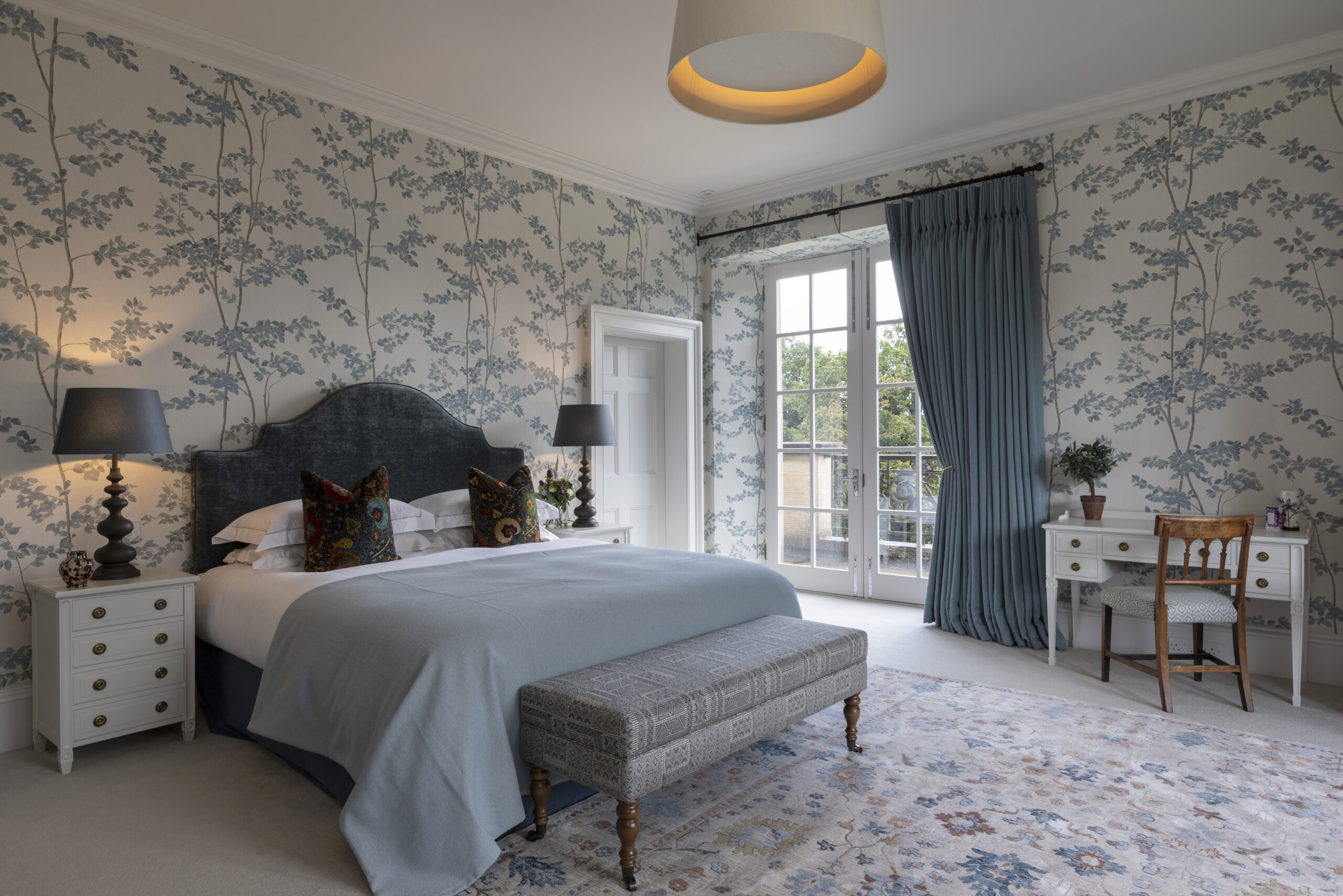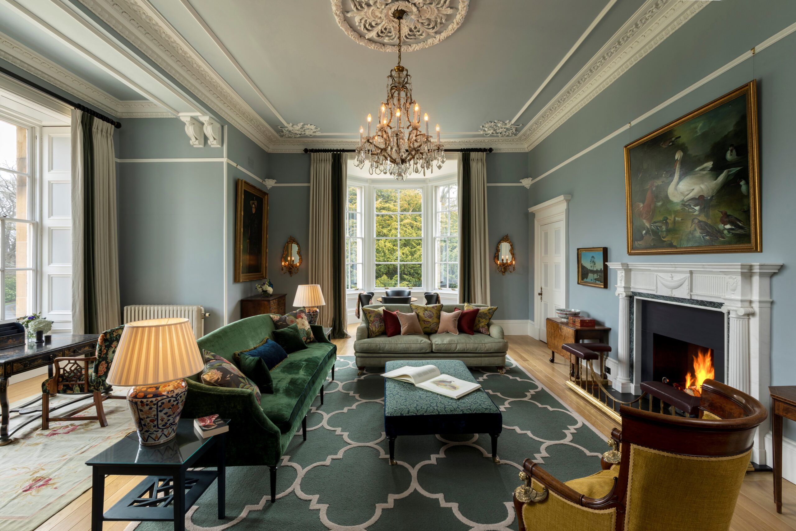 The interior of Broich house is contemporary meets Scottish tradition and it provides a perfect holiday stay. Every room is filled with luxurious furnishings, and has plenty of light and space, bold wallpapers and modern light fittings, contrasting with the stunning plaster work, cornices, and elegant high arched corridors.