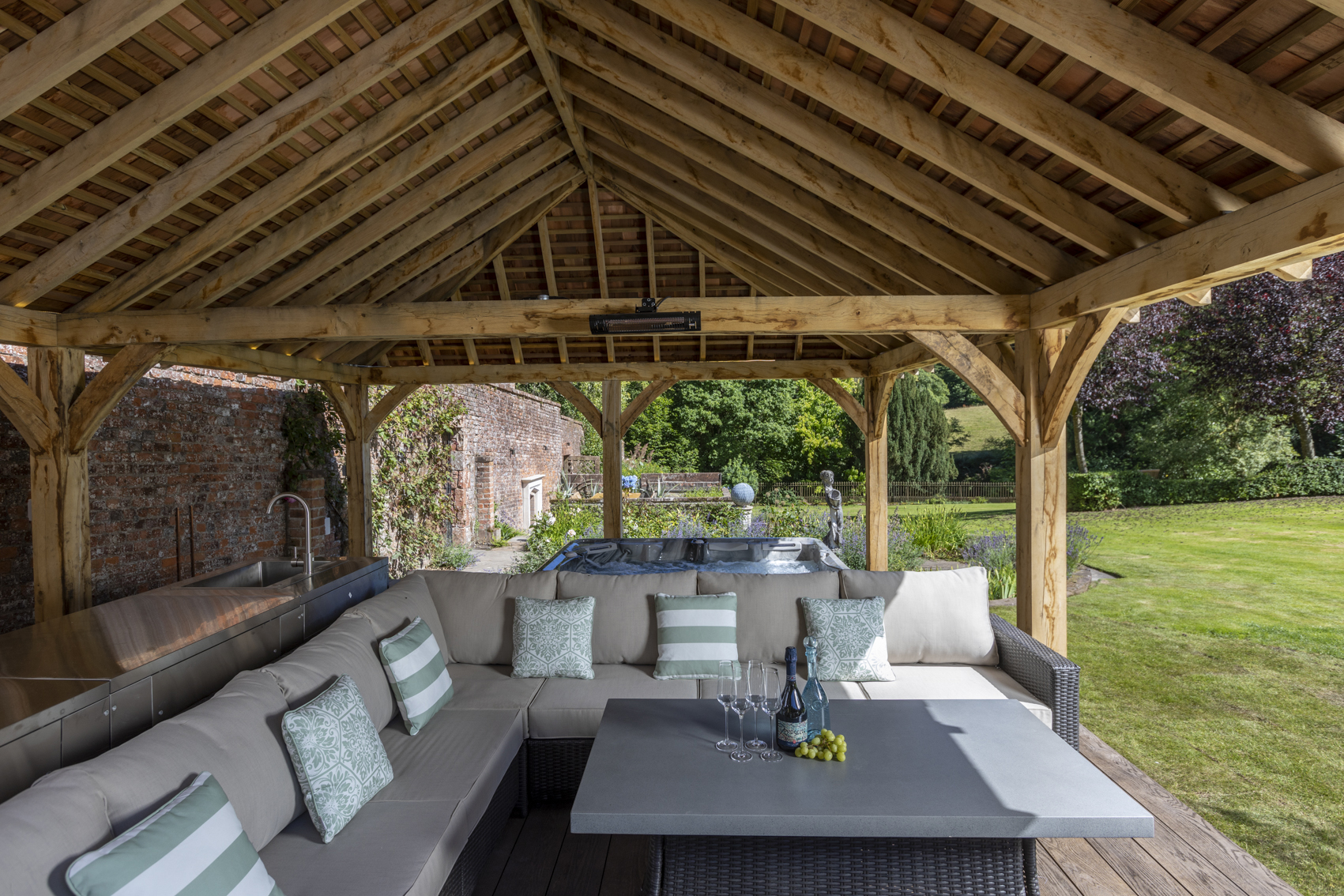 The Victorian Walled Garden has a croquet lawn, fabulous outdoor dining for 14 guests and soft seating covered by an oak gazebo alongside a hot tub, shower and outdoor kitchen.