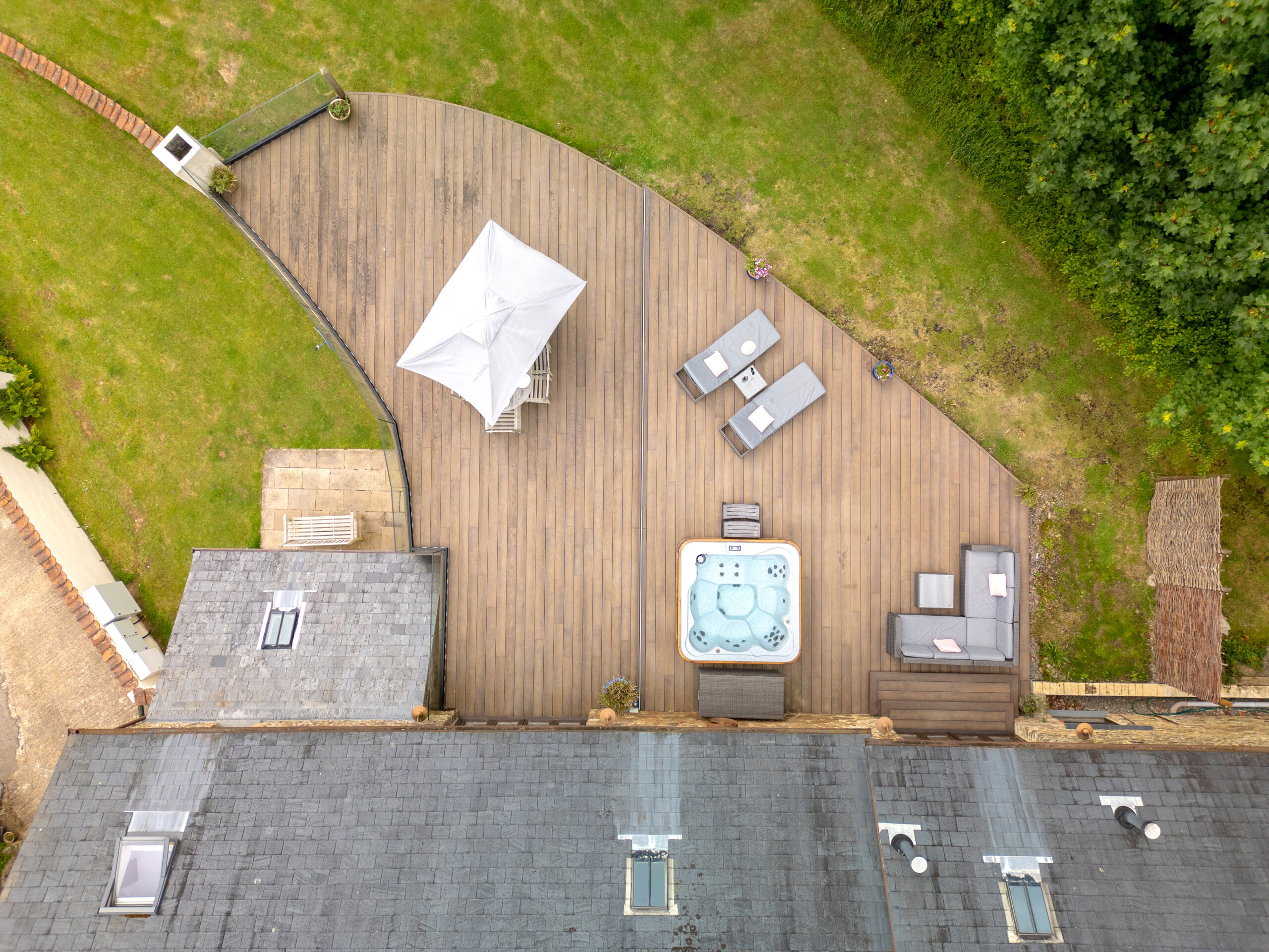 A south-facing terrace with hot tub, barbecue, sun loungers and rattan seating completes the space.