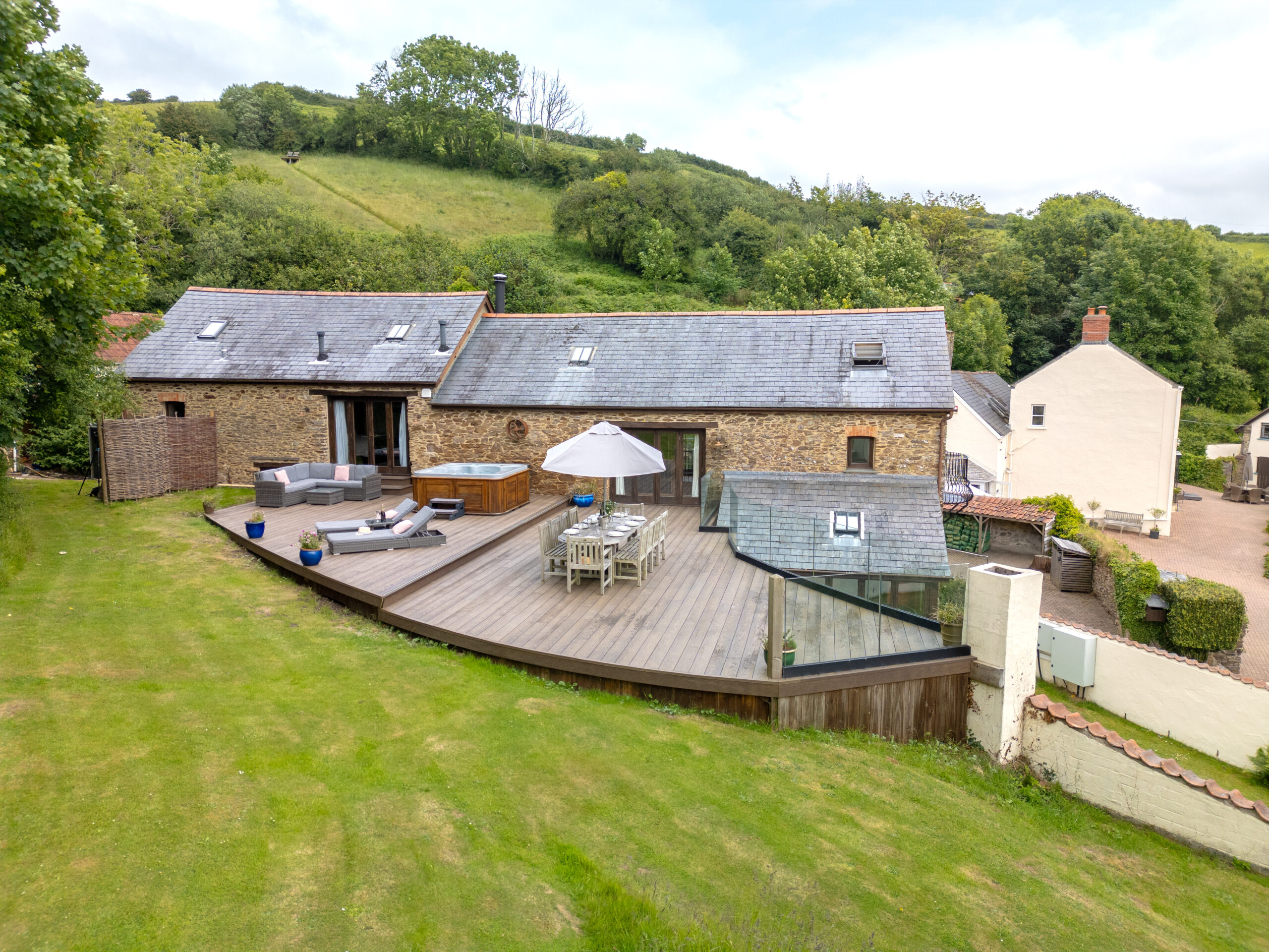 Outside, a south-facing terrace with hot tub, outdoor seating and chiminea offers a lovely spot to unwind.