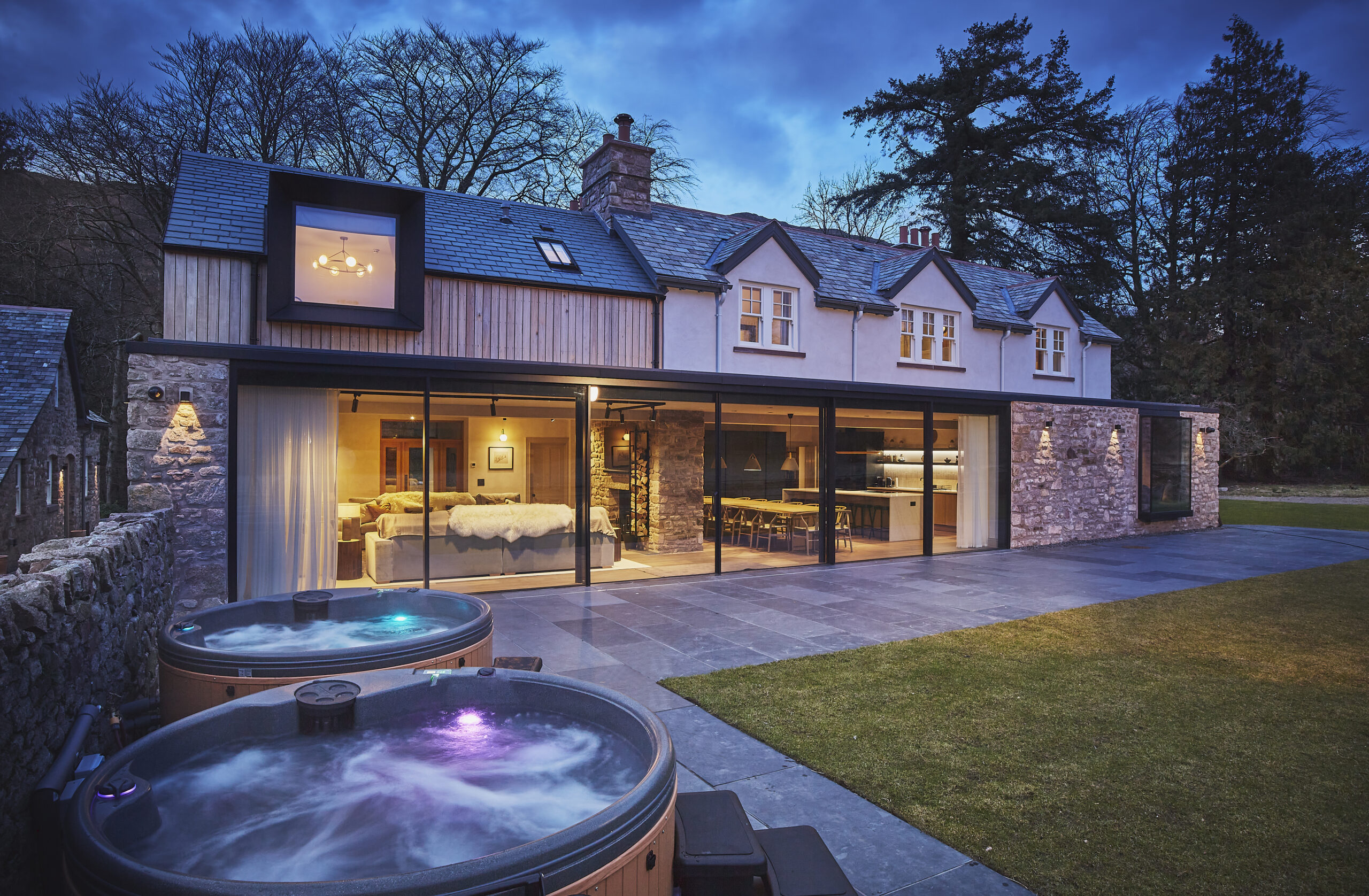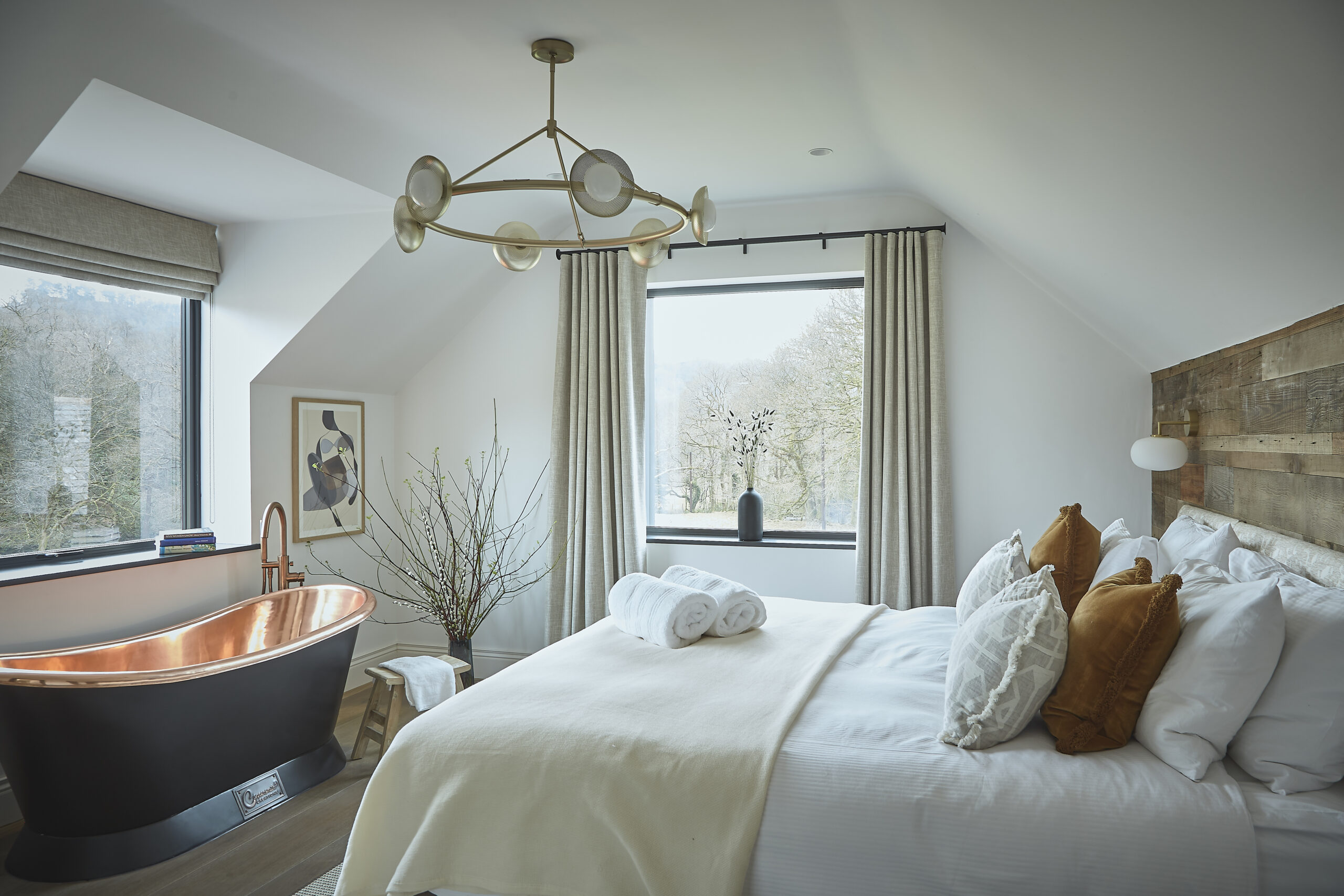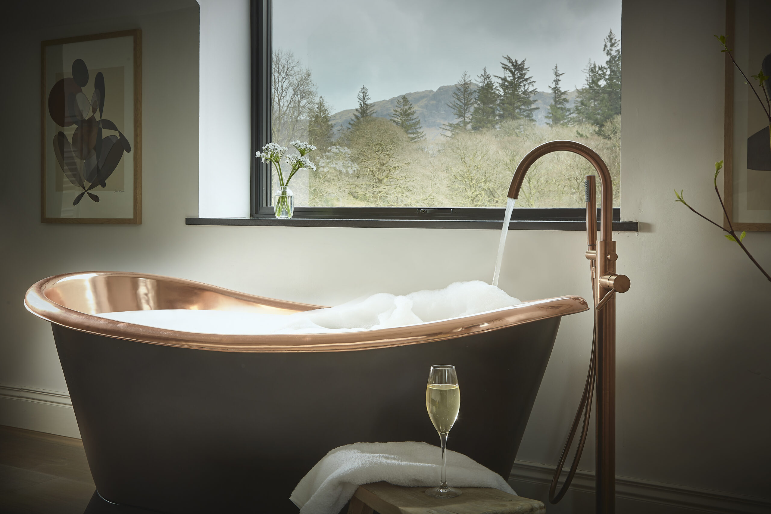 - Two bedrooms feature freestanding statement baths — one an elegant copper roll-top, the other a sleek black tub with views of the fells.