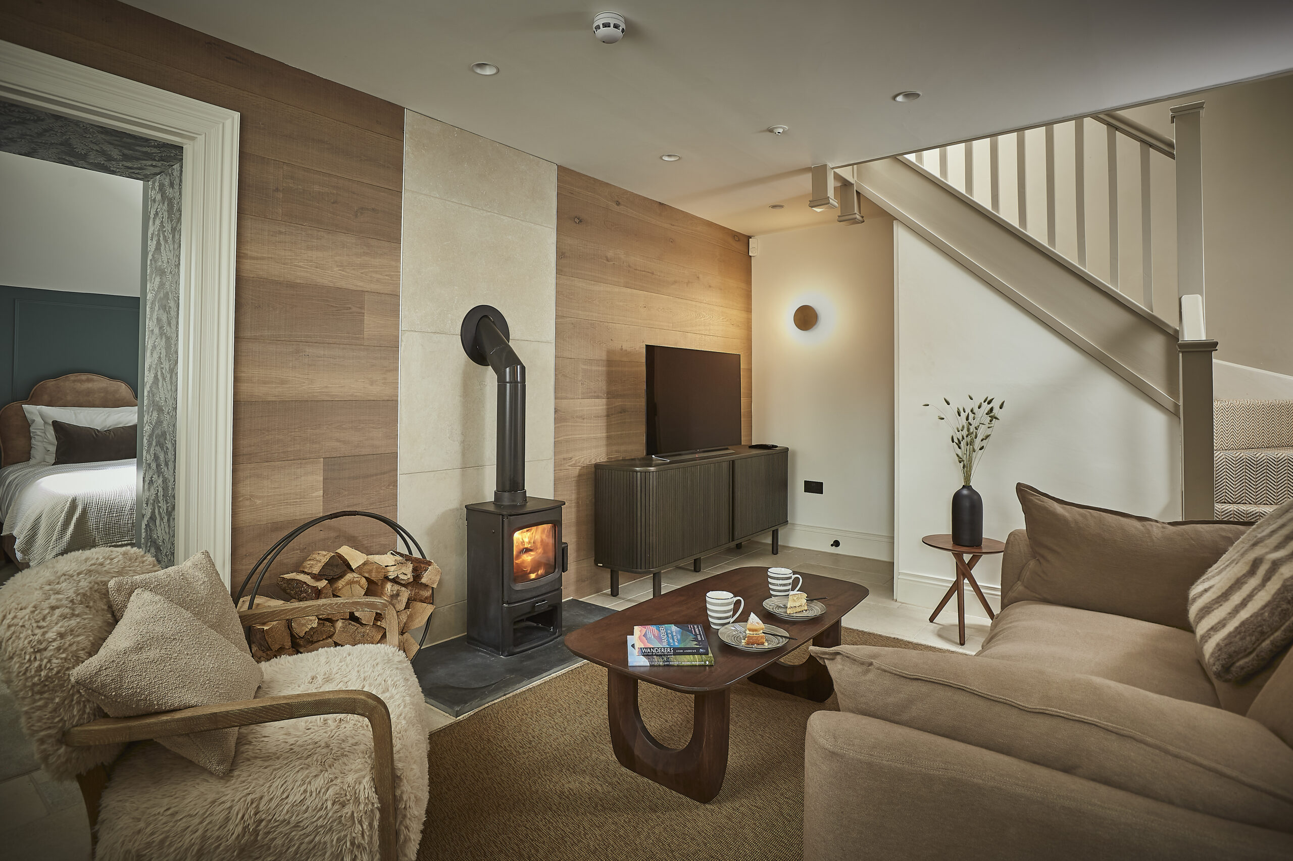 - A double-sided log burner glows between the lounge and dining areas, perfect for fireside suppers or quiet evenings with a book.