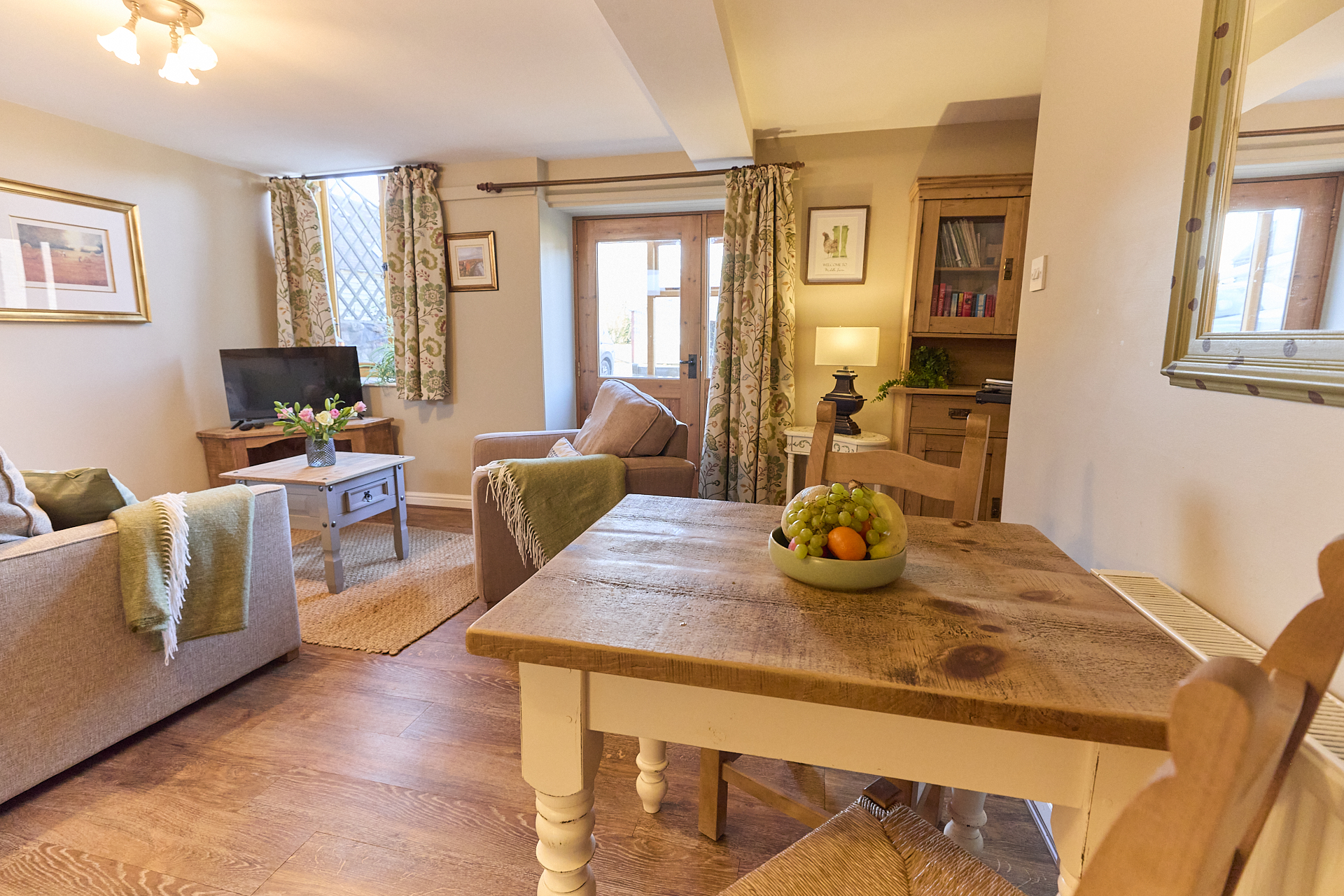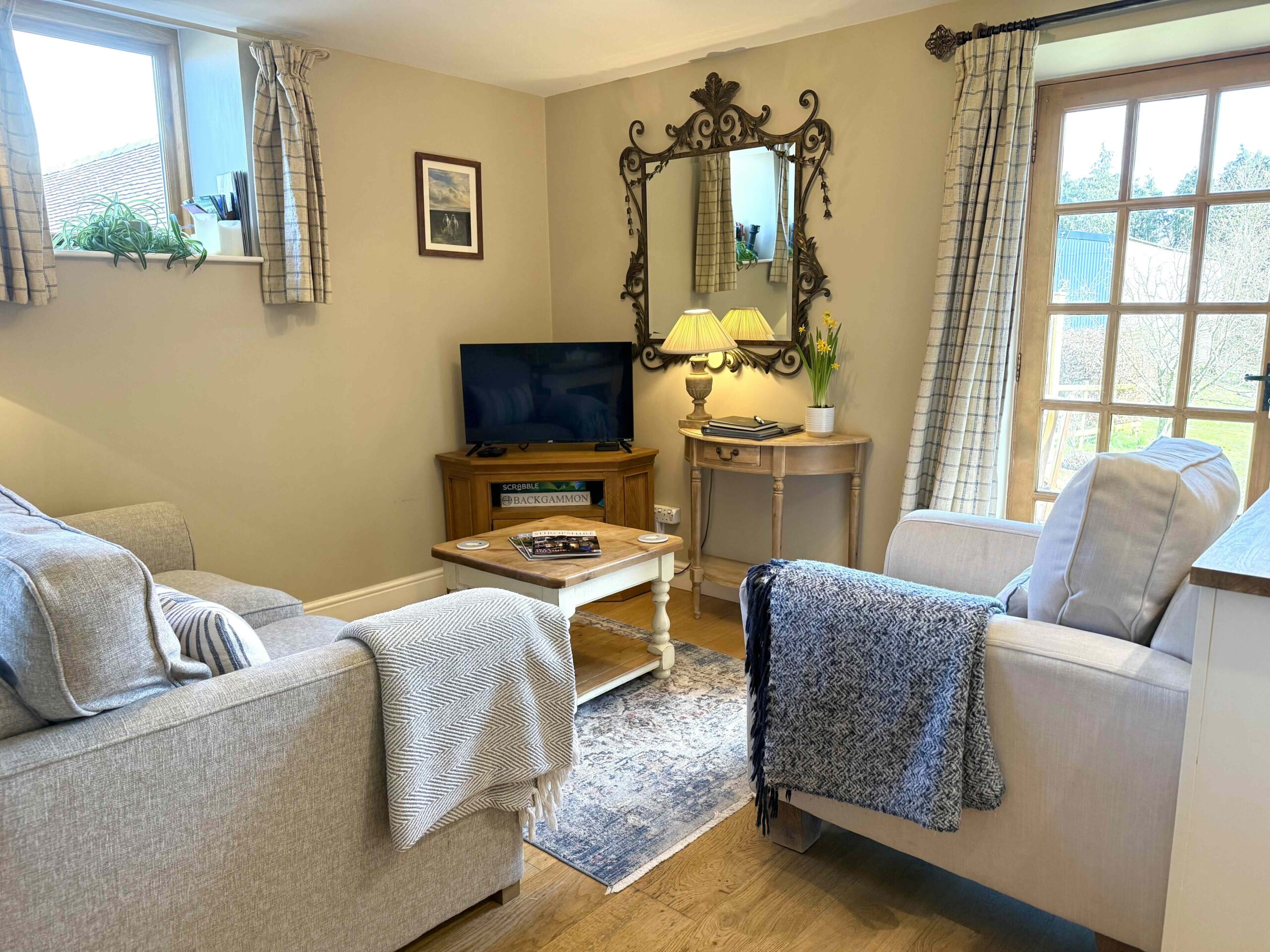 - Sitting room with deep sofas and a 40” Smart TV