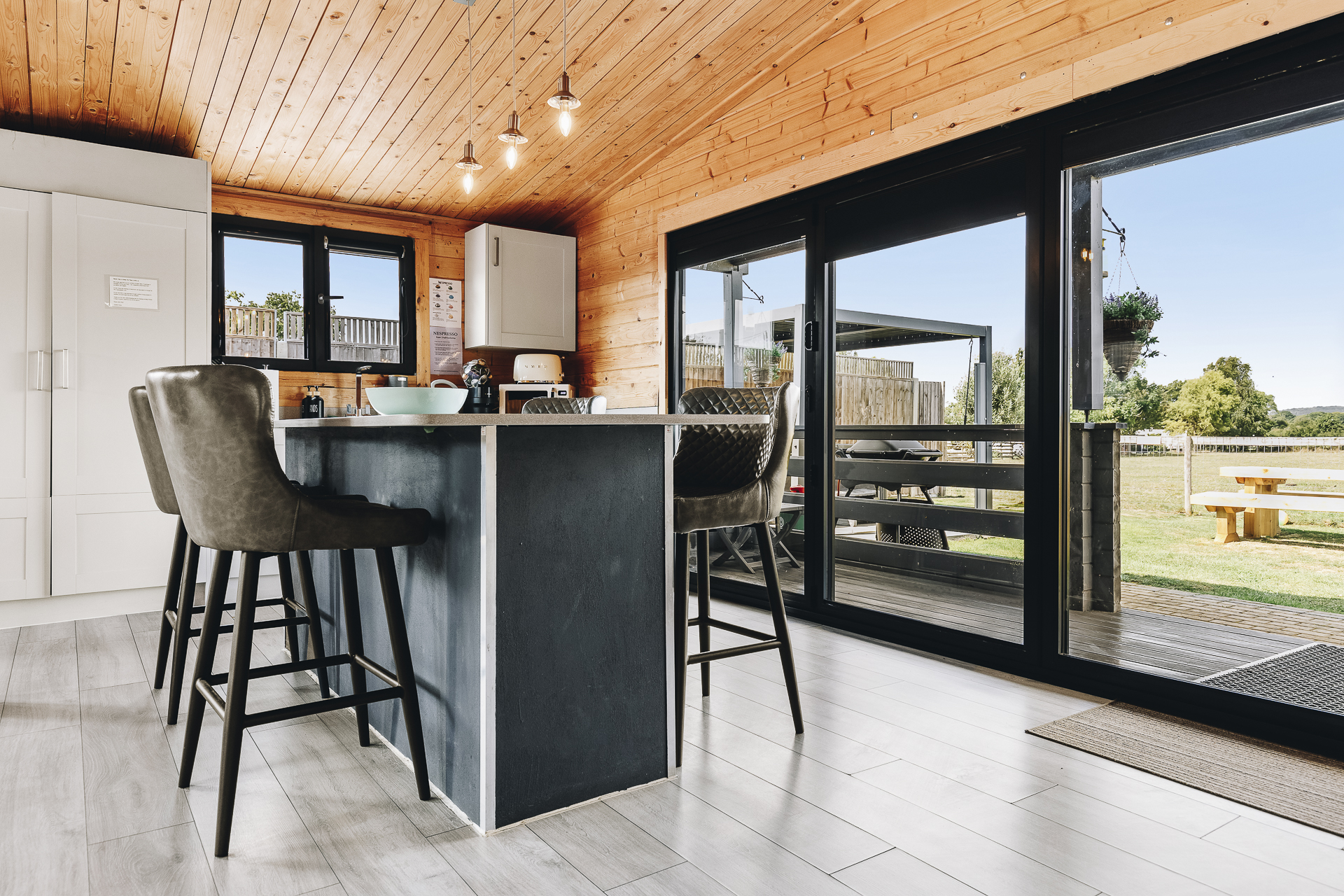 A bright, beautifully finished log cabin with uninterrupted farmland views framed by expansive bi-fold doors.
