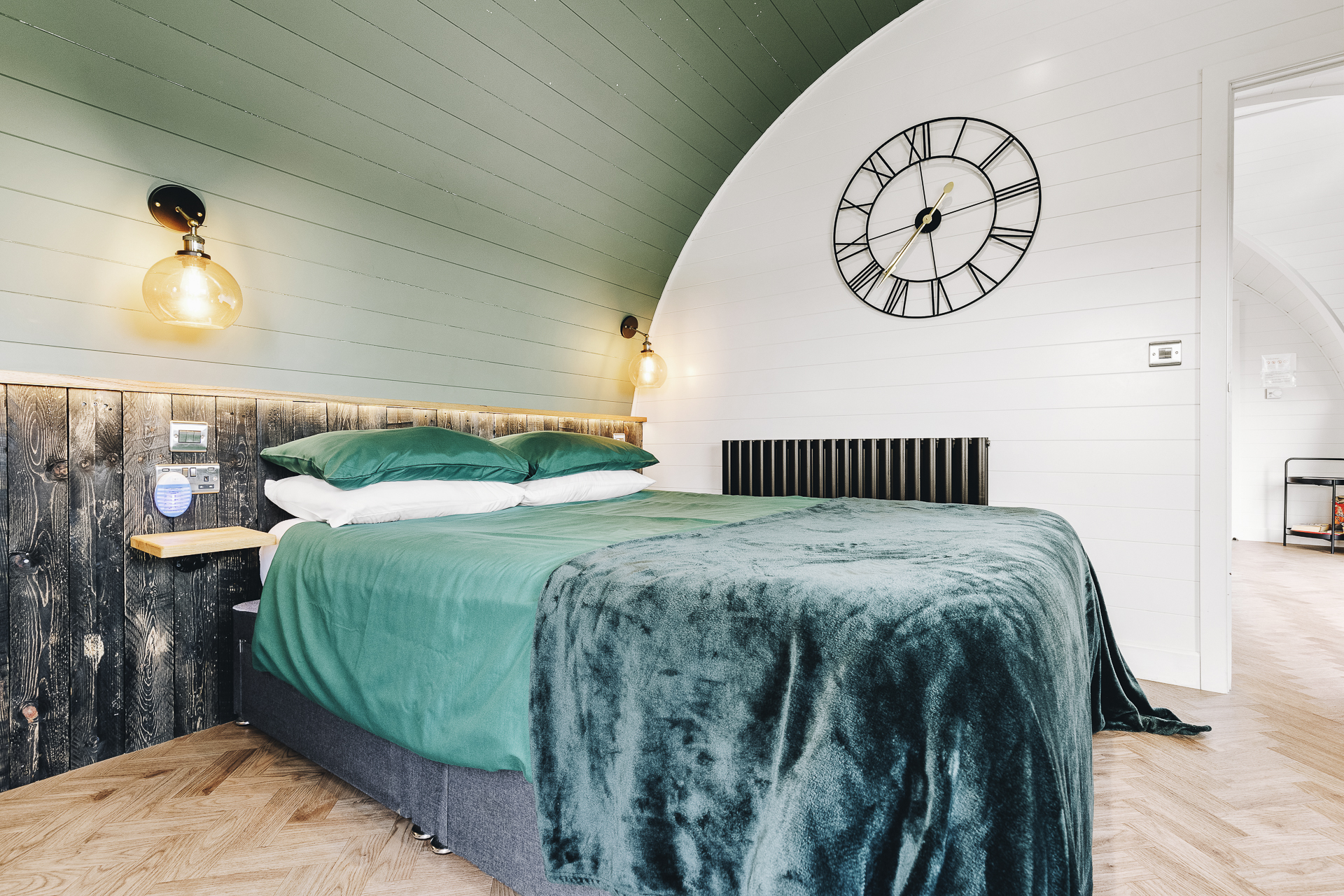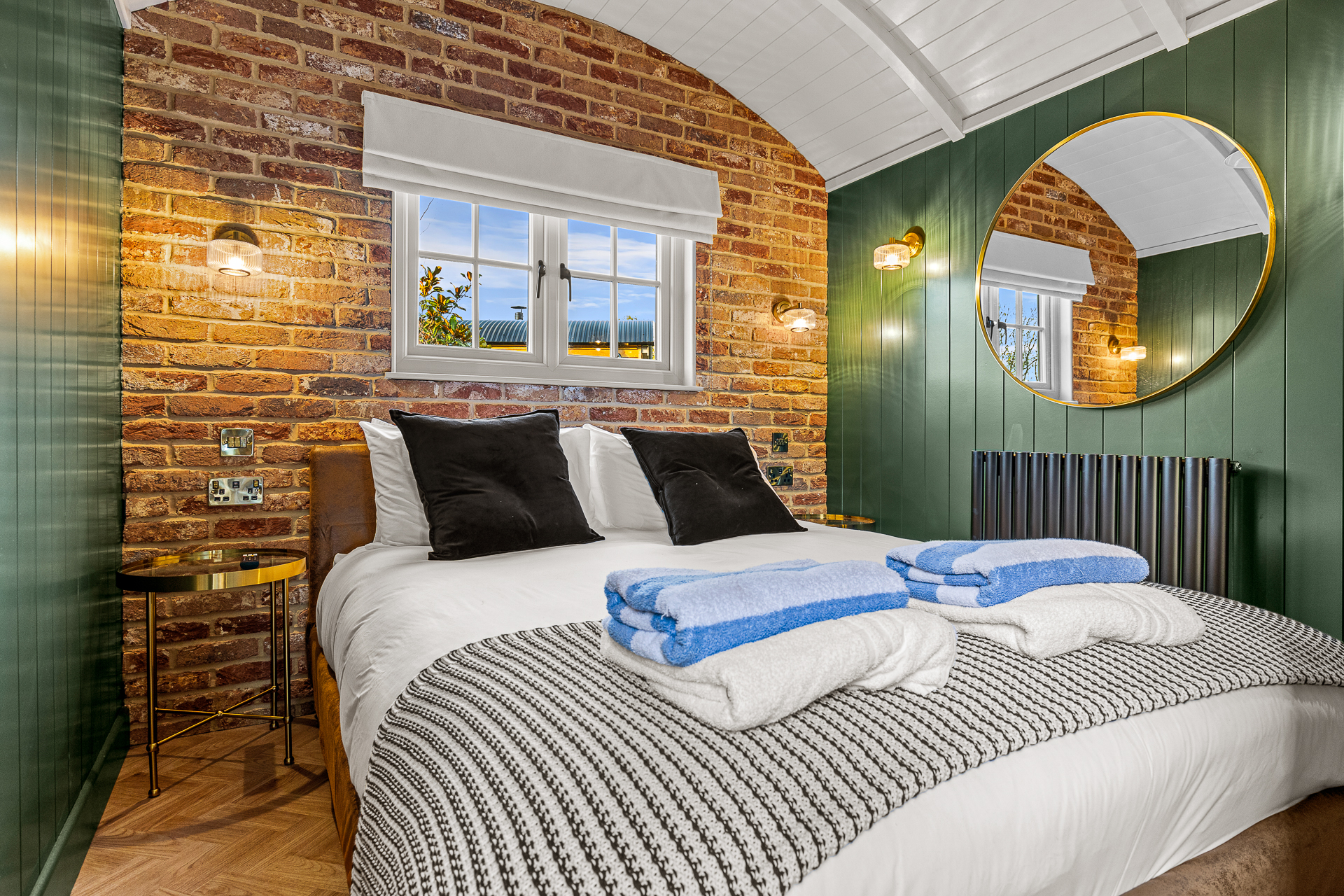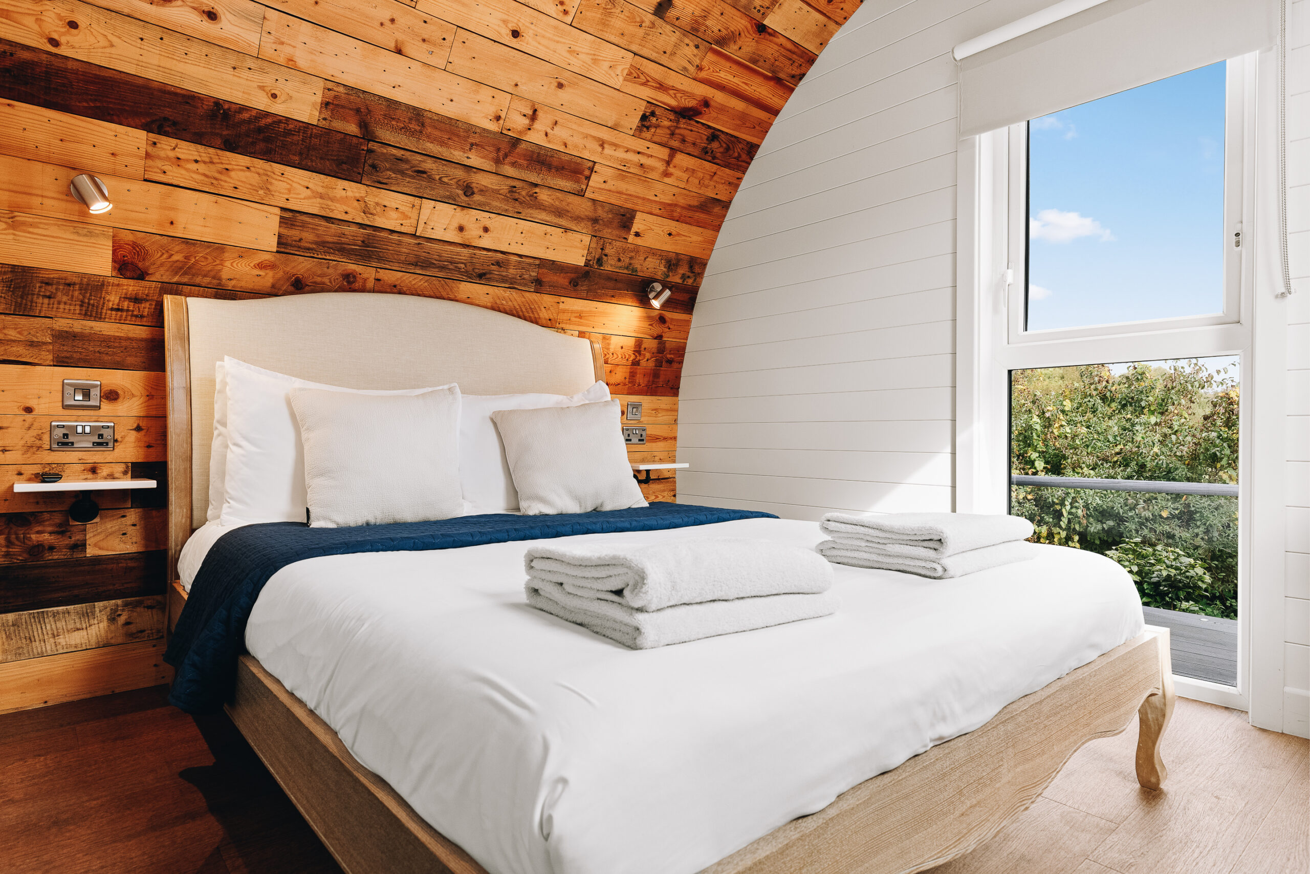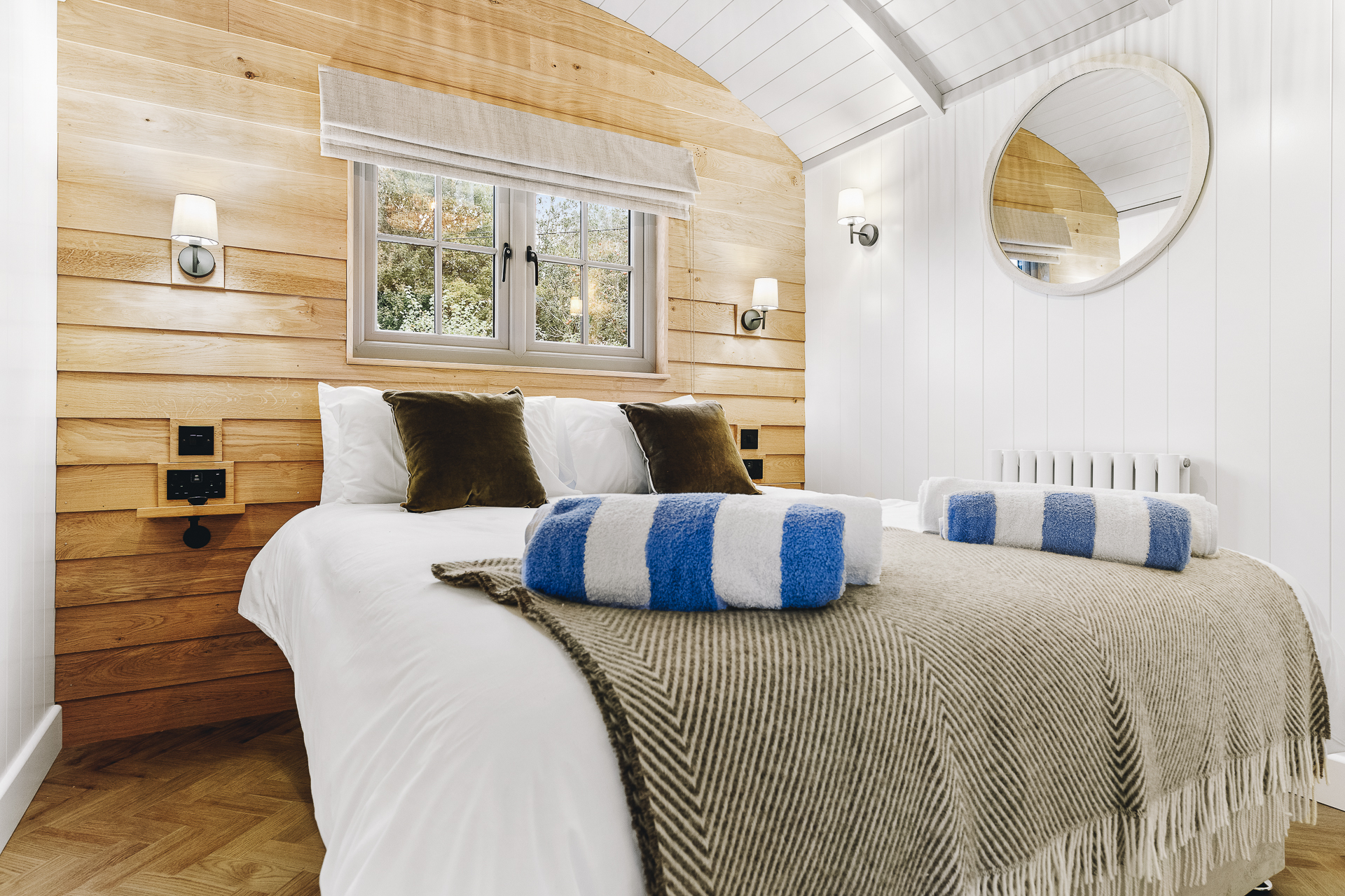 Four two-bedroom shepherd’s hut-style woodland retreats – The Oak, The Hide, The Willow and The Grove – each sleeping up to 4 guests in calming Scandinavian-inspired interiors and surrounded by towering trees. A great choice for couples, groups of friends or families wanting a modern, design-led escape with spa-like touches.