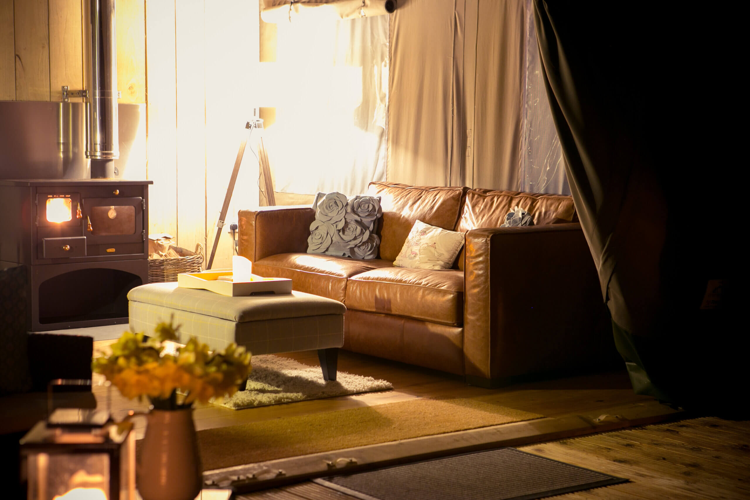 Owners Abigail Shaphan have designed each safari tent with exquisite attention to detail, providing a wonderful and spoiling experience with breathtaking views. Inside you’ll find an equipped kitchen, a roomy sitting room area with a large sofa to relax and a log burning stove to keep you warm and to cook from – with a hotplate that acts as a hob and an oven compartment.