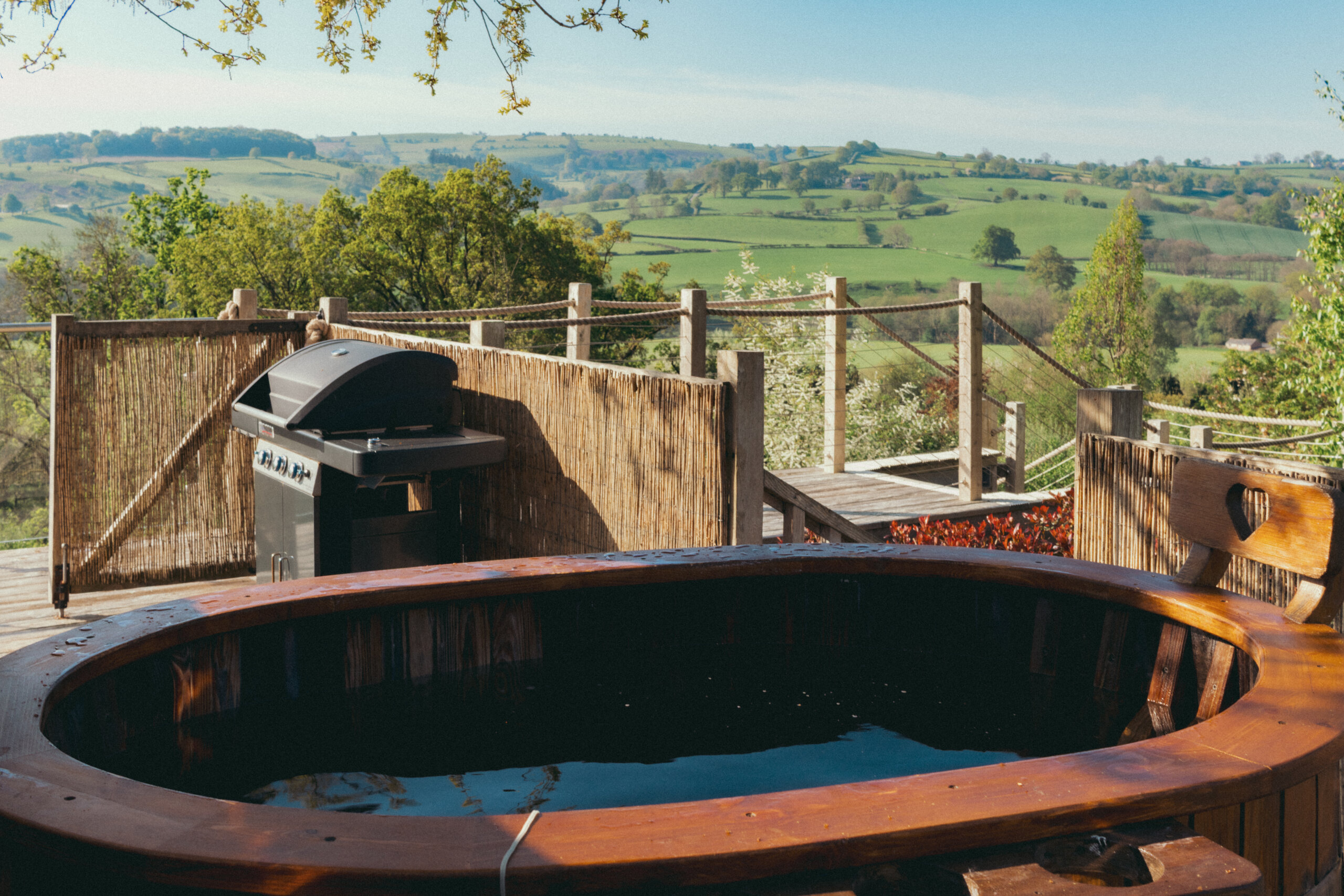 Outside Heartwood Treehouse – a balcony, wood fired private hot tub, bbq & fire pit