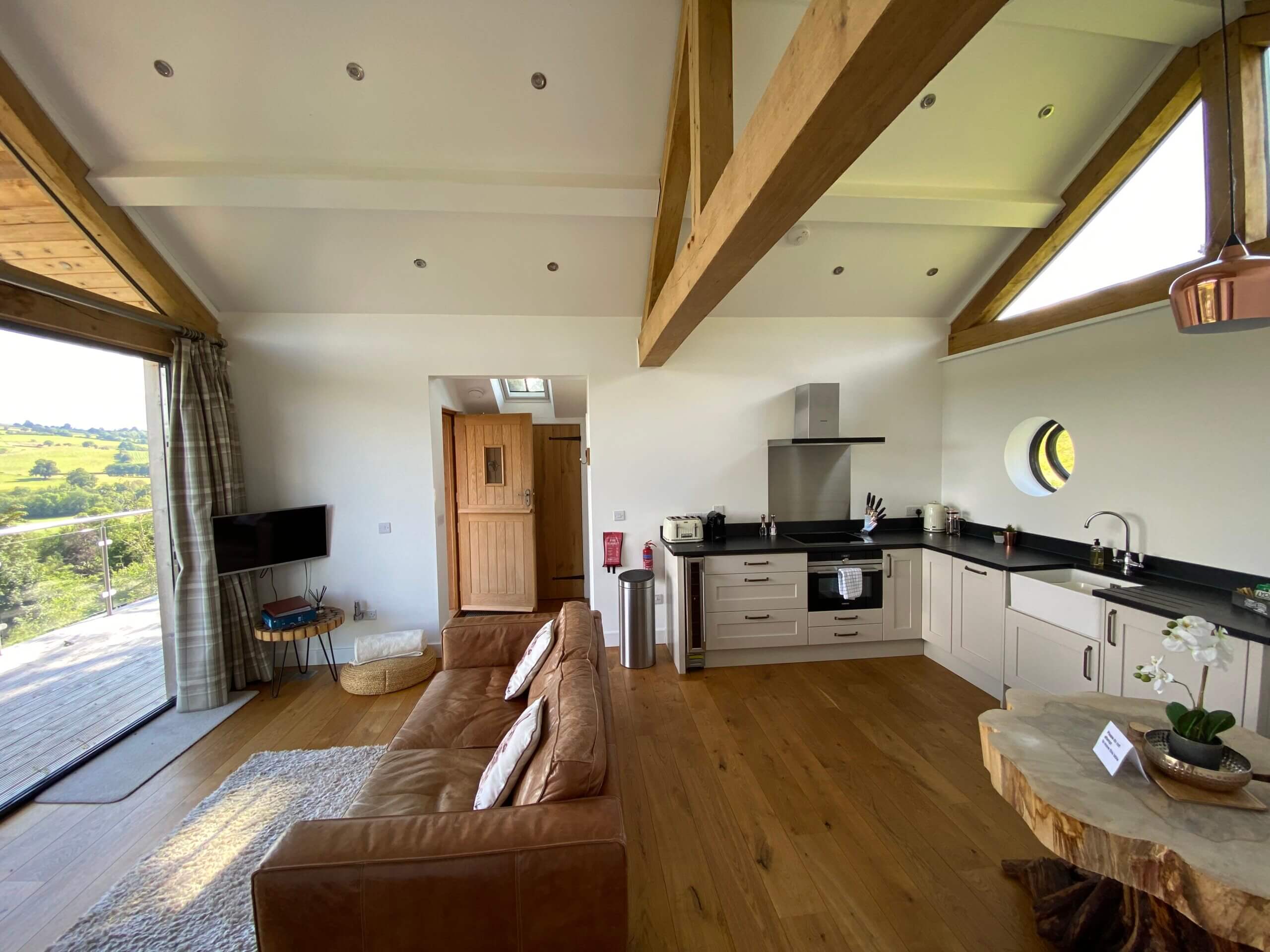 The sitting room and kitchen are large and open plan with a south facing leather sofa facing the hilltop panoramic views and must have cosy log burner to relax and enjoy on colder winter evenings. There is a flat screen TV and good 4G, but no wifi.