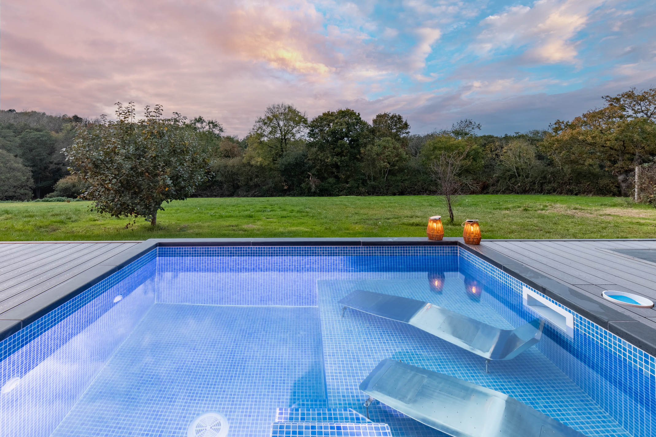 An adult-only spa retreat in North Devon, sleeping up to four guests, with luxurious ensuite bedrooms, a private hydro spa pool, sauna, meadow views and a peaceful off-grid setting designed for deep rest and reconnection.
