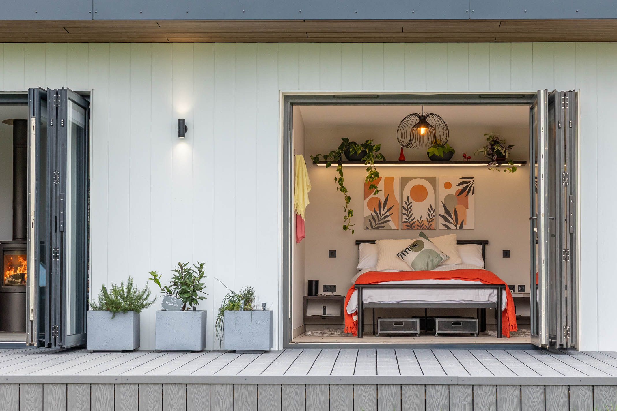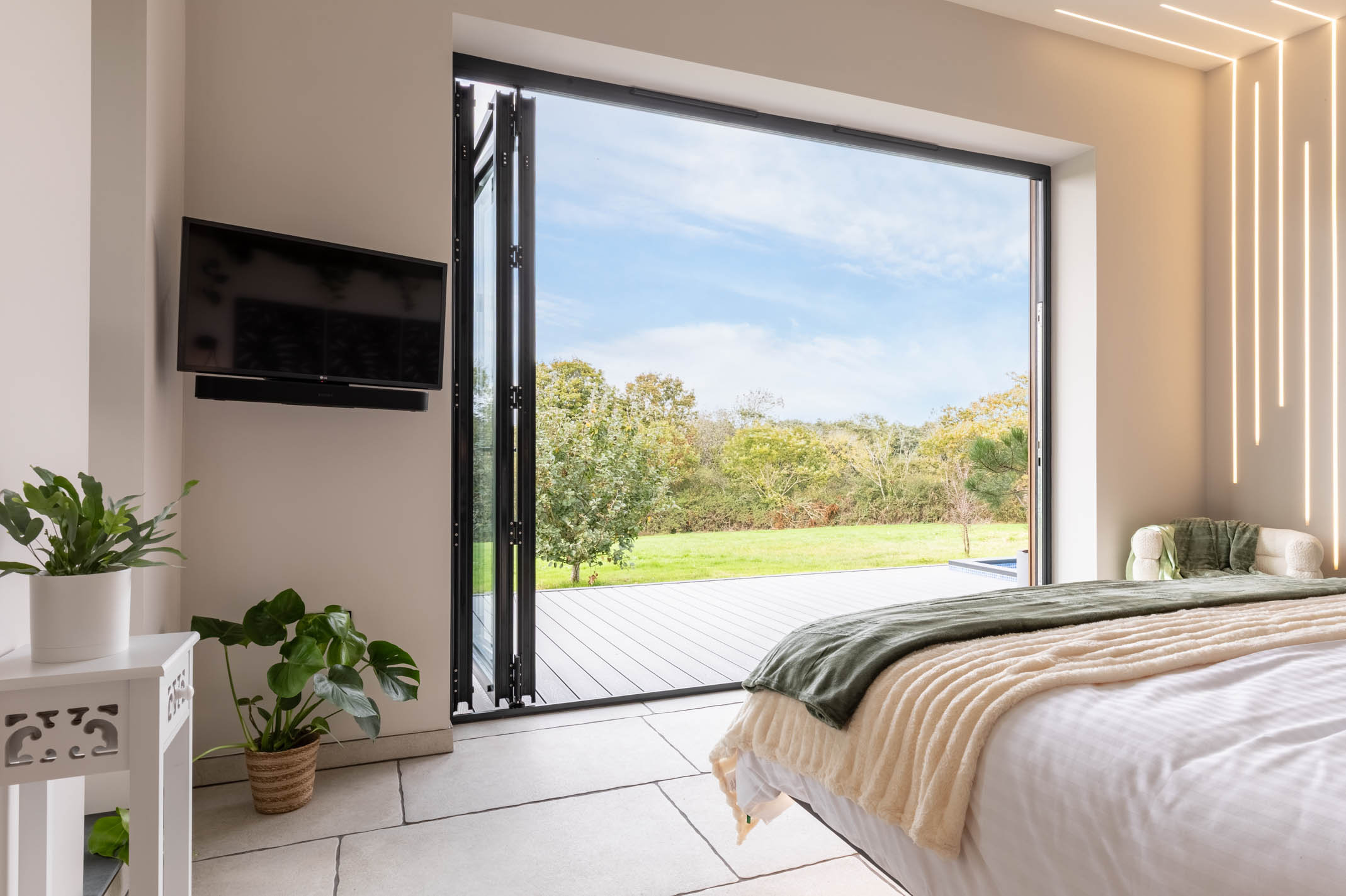 • Large bifold doors in both bedrooms, opening out to meadow views and letting the landscape become part of the space