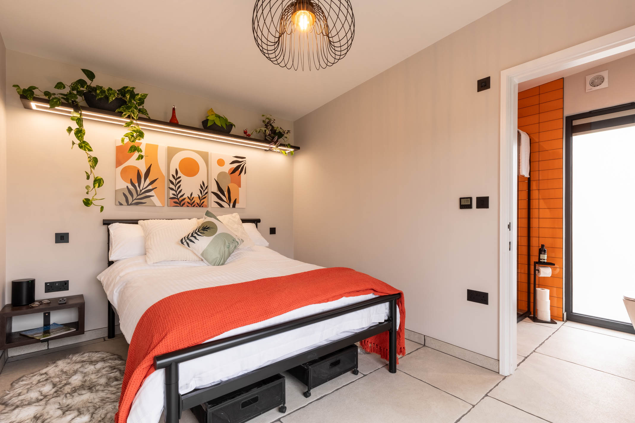Life here centres on slow, sensory pleasures. Open the bifold doors to birdsong and fresh air, spend long afternoons drifting between the heated hydro spa pool and sauna, or settle in for relaxed evenings by the fire as the light fades across the fields. Being off-grid adds to the feeling of escape, but everything has been thoughtfully considered – creating a stay that feels luxurious without being overdone.