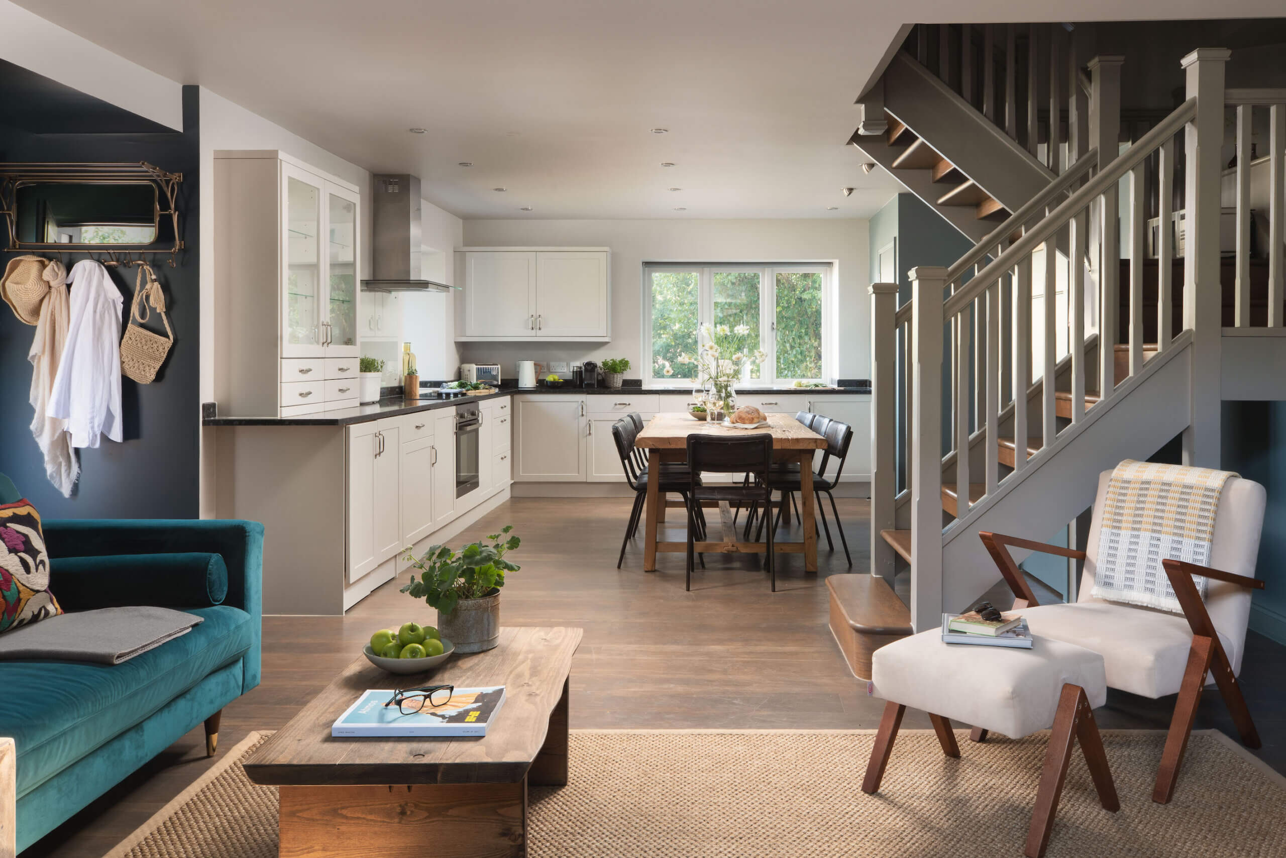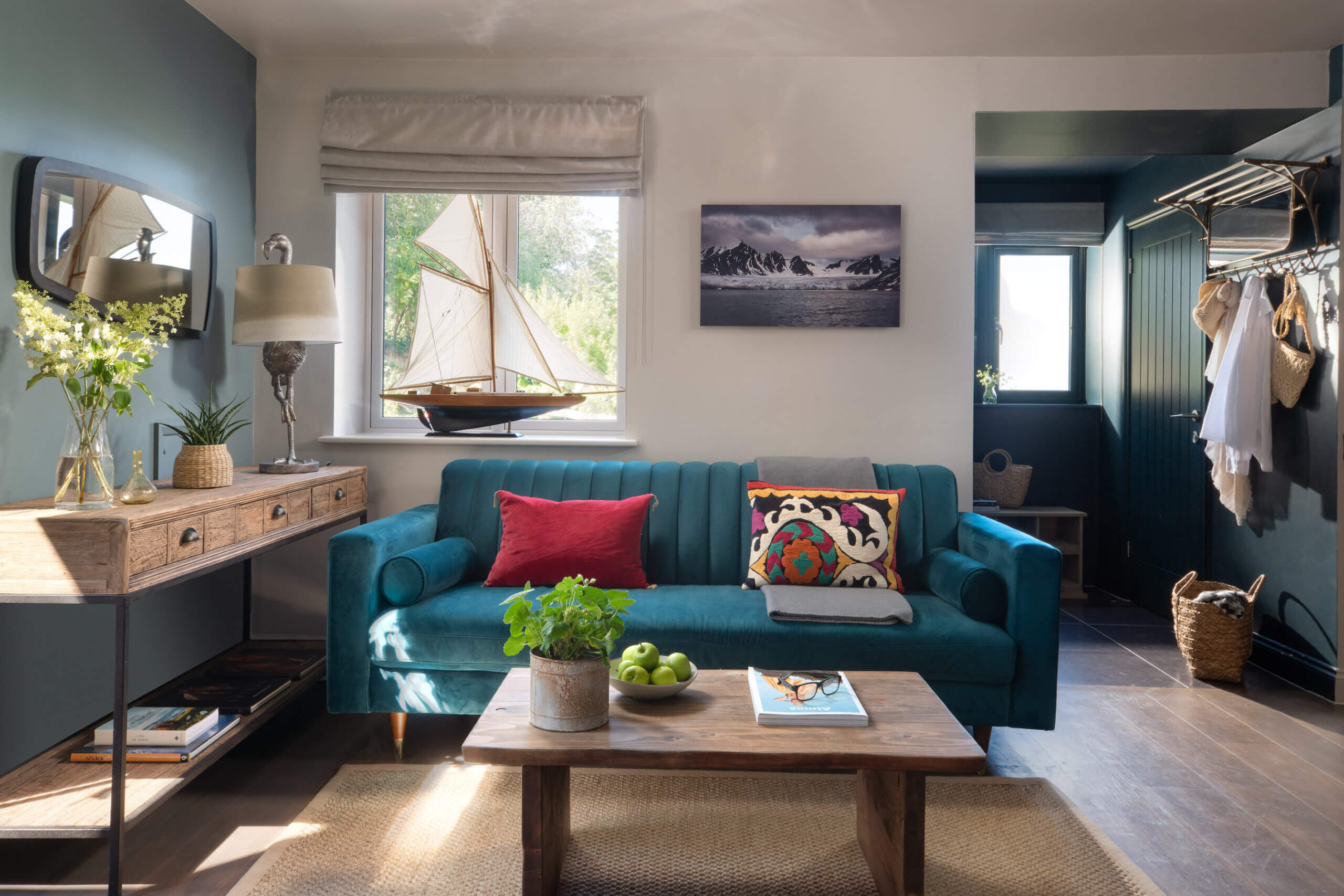 - Spacious open-plan living area with a gorgeous sofa and a wood burner—the perfect place to snuggle up with a book by the fire during those cooler months.