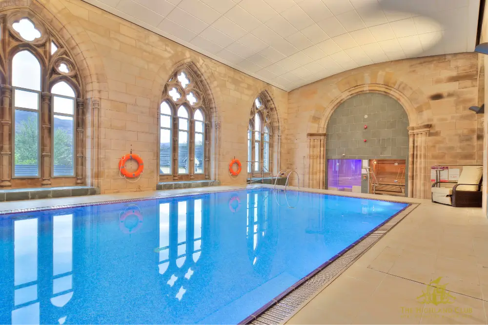 Loch Ness luxury accommodation in the former Fort Augustus St Benedict’s abbey next to Loch Ness in the Scottish Highlands, with shared access to Spa with indoor pool, steam room and sauna, games room and tennis court