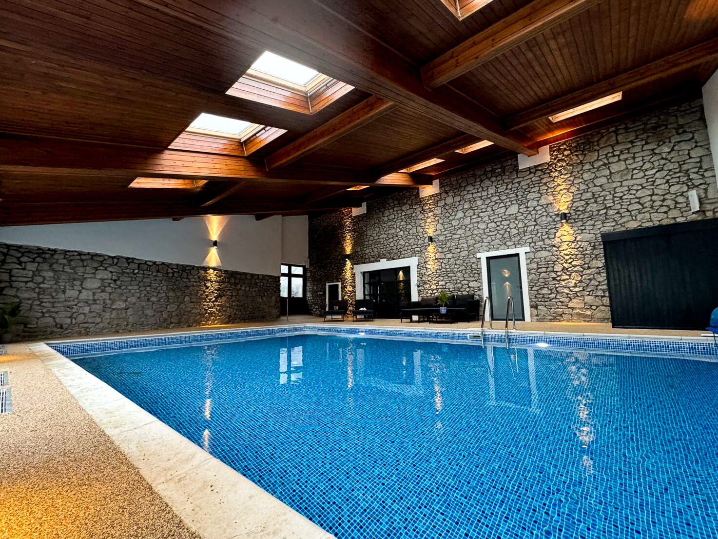 The indoor heated pool has a depth of 5 feet, with showers, changing facilities and a wooden sauna, all designed for relaxation and rejuvenation. Bi-fold doors from the pool open out onto a private walled garden with patio and relaxing area.