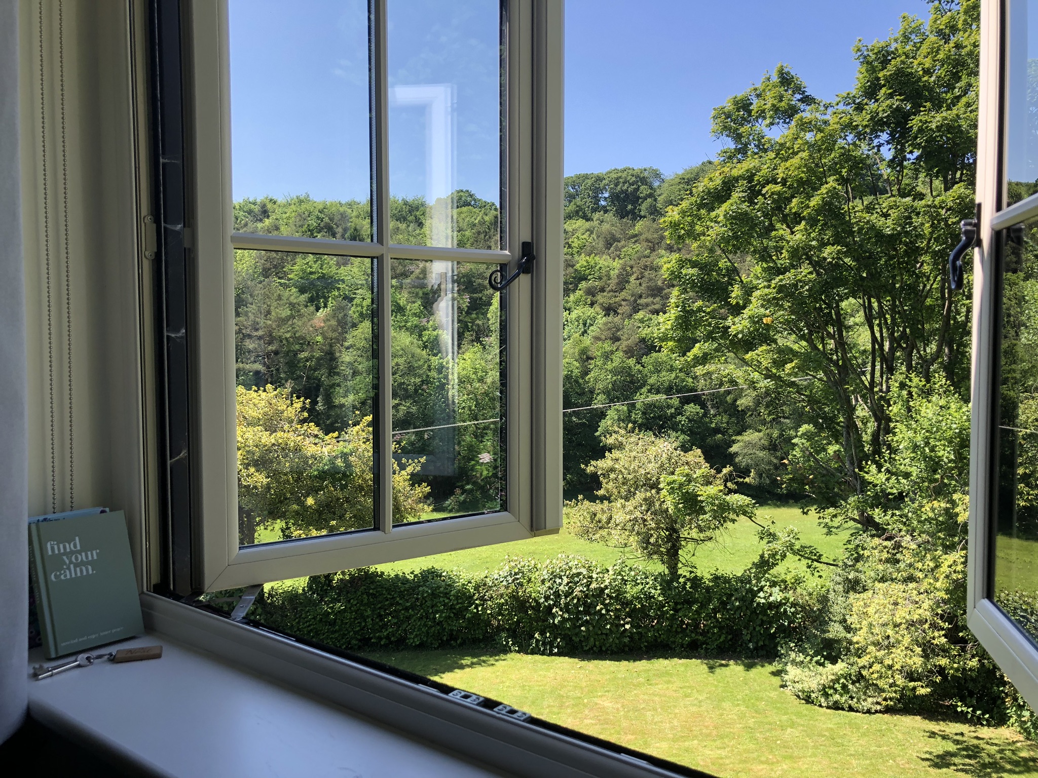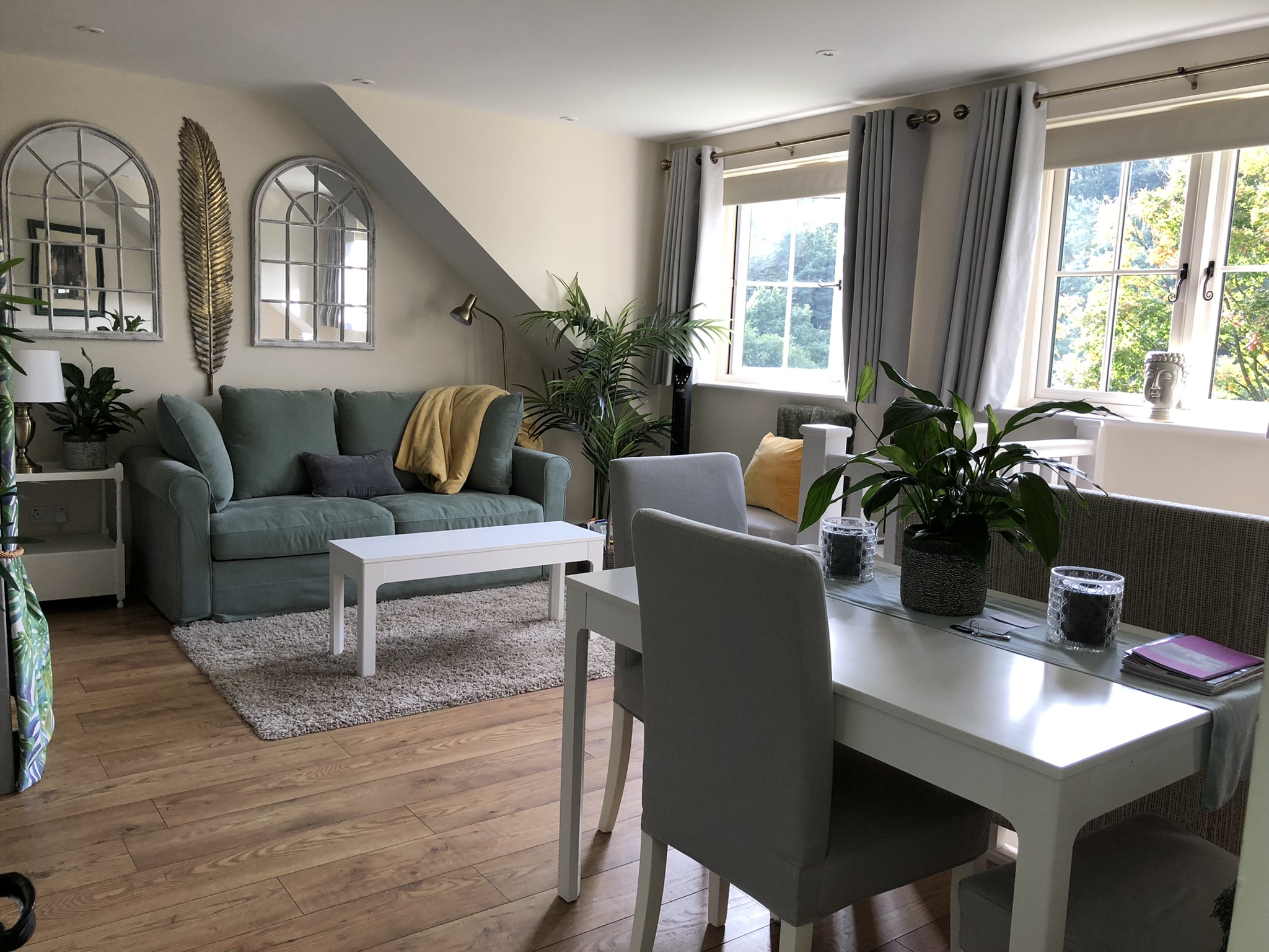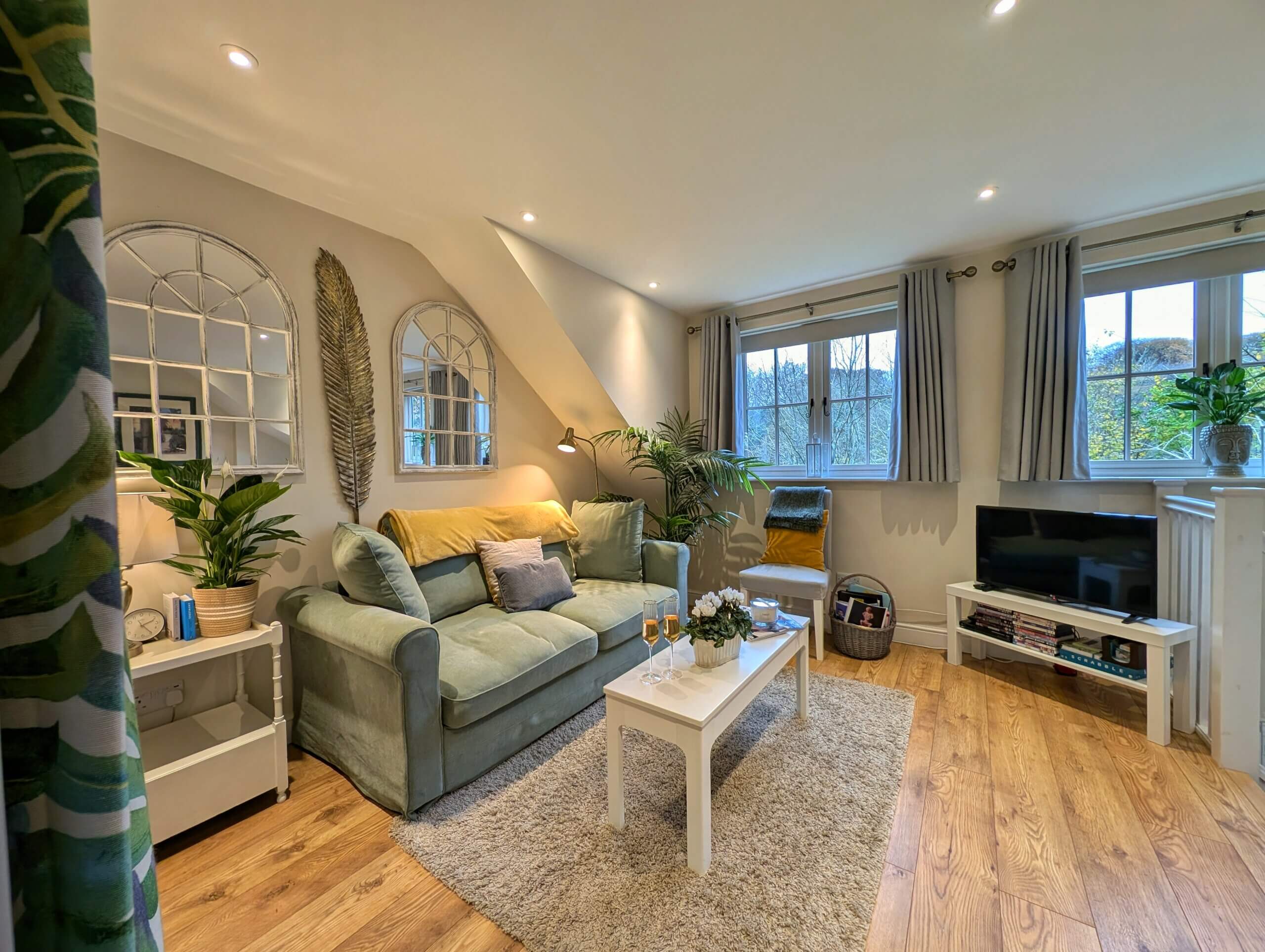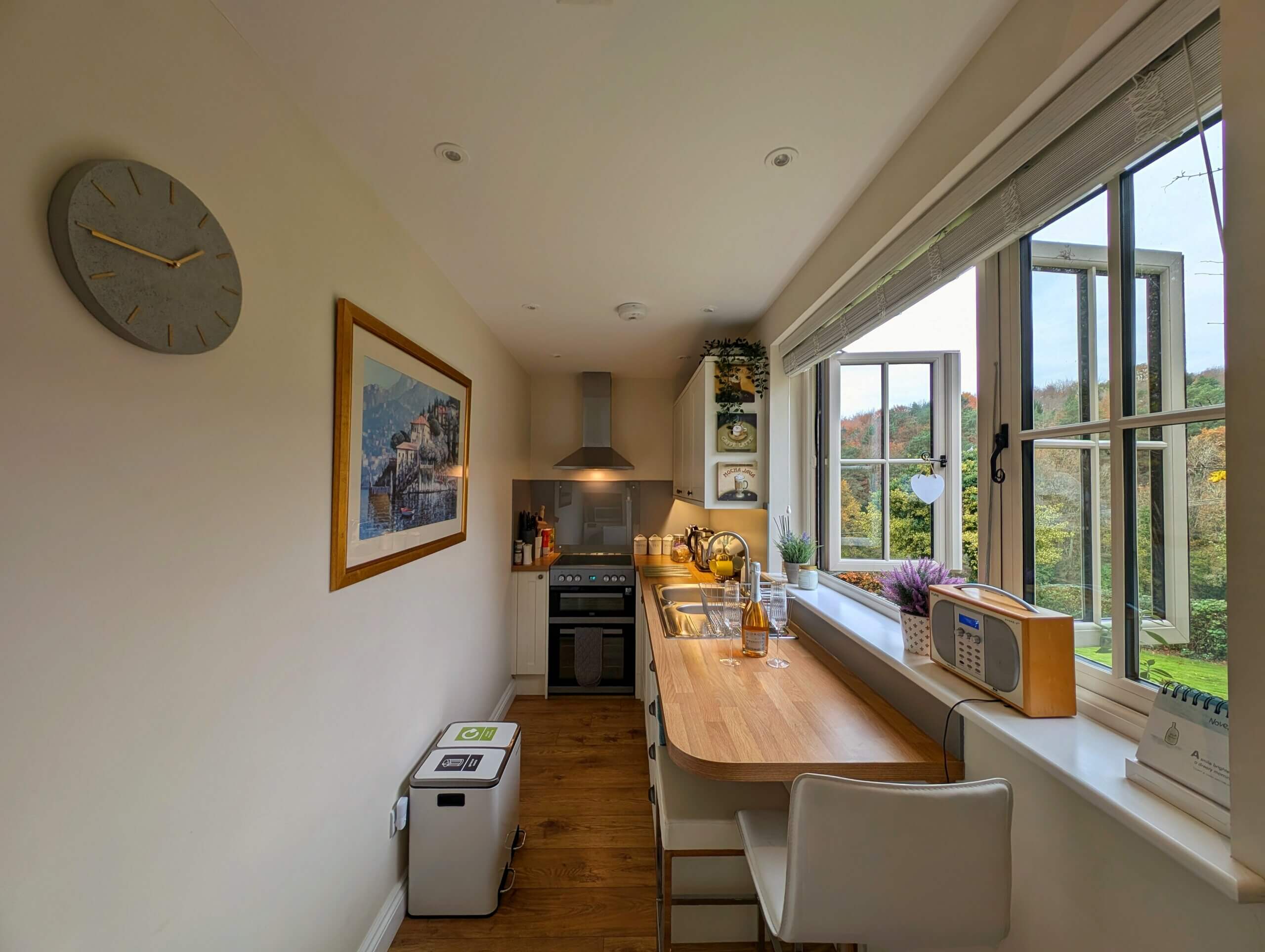 - Downstairs: A fully equipped kitchen with everything you need for relaxed self-catering – double oven, ceramic hob and grill, washer/dryer, and a Nespresso coffee machine. French windows open out to the garden, with a breakfast bar for two perfectly placed for morning coffees with woodland views.