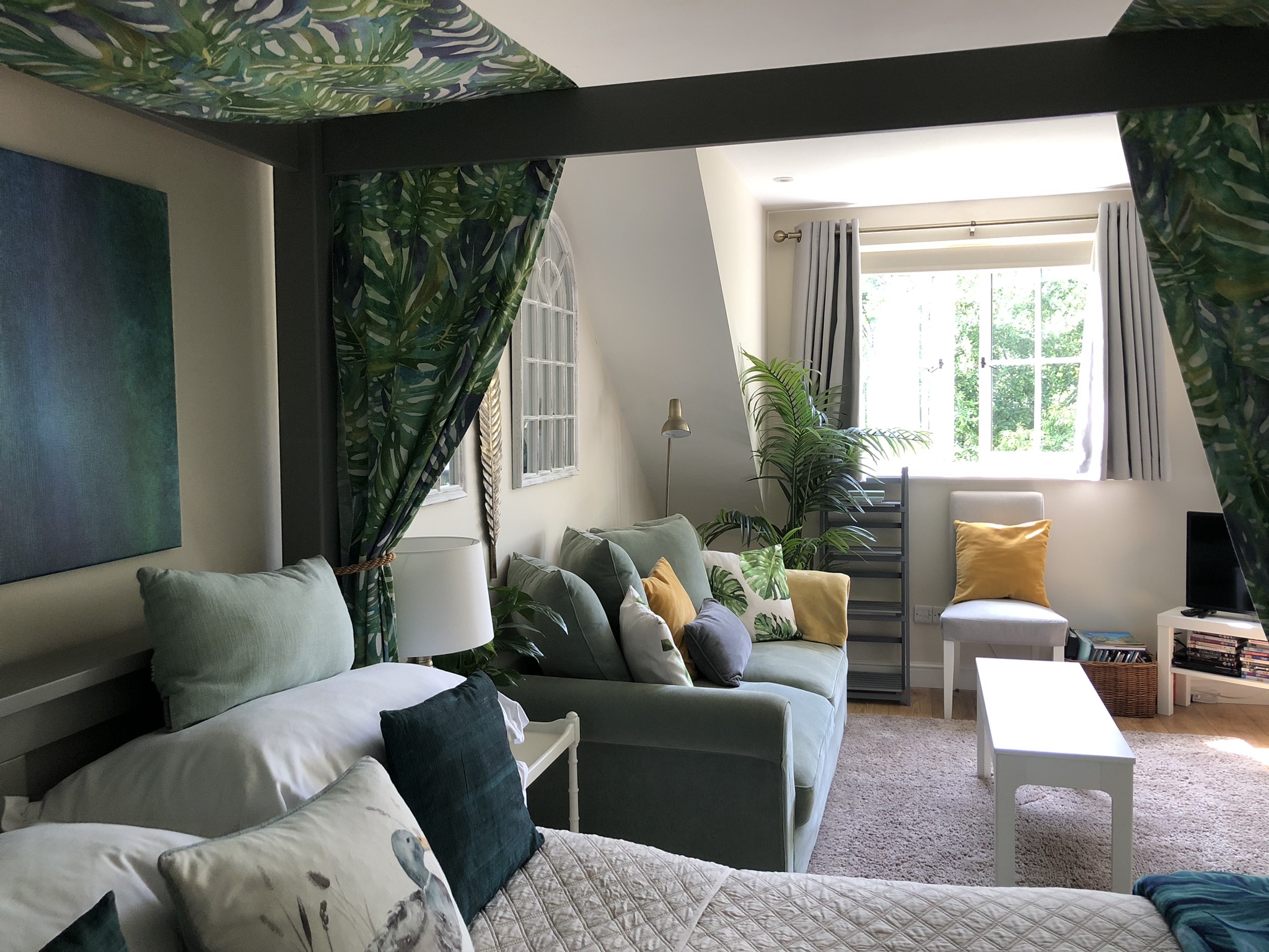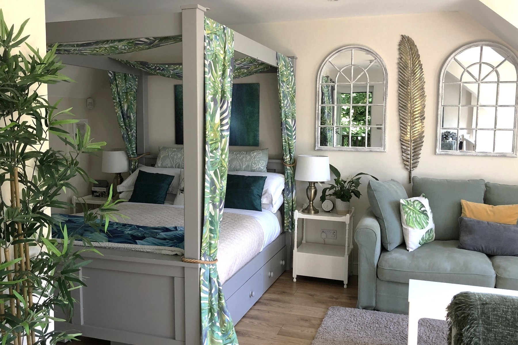 - Upstairs: An open-plan living and sleeping space featuring a sumptuous king-size four-poster bed dressed with Egyptian cotton linen, a goose down duvet and hypoallergenic pillows. There’s also a sofa that converts into a double bed – ideal for young children.