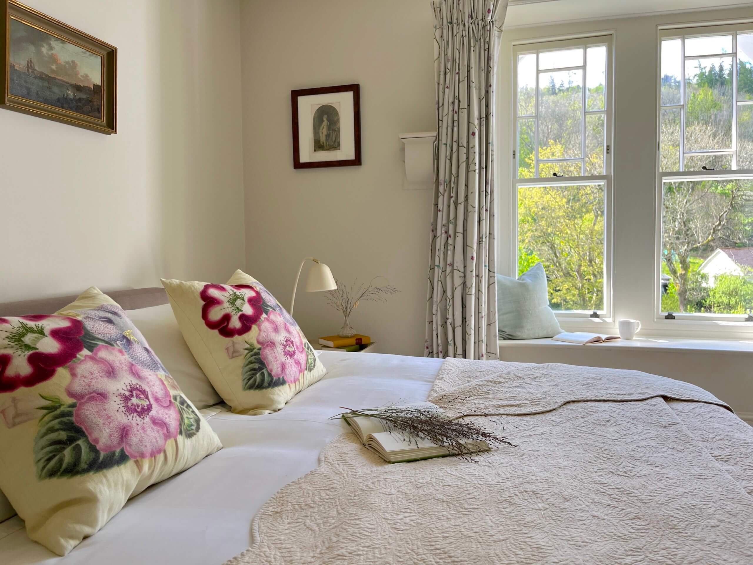 - Cazlet Bedroom – Located on the first floor, the third bedroom features a super king-size bed with Hypnos mattress and south-facing views of the Fuschia valley.