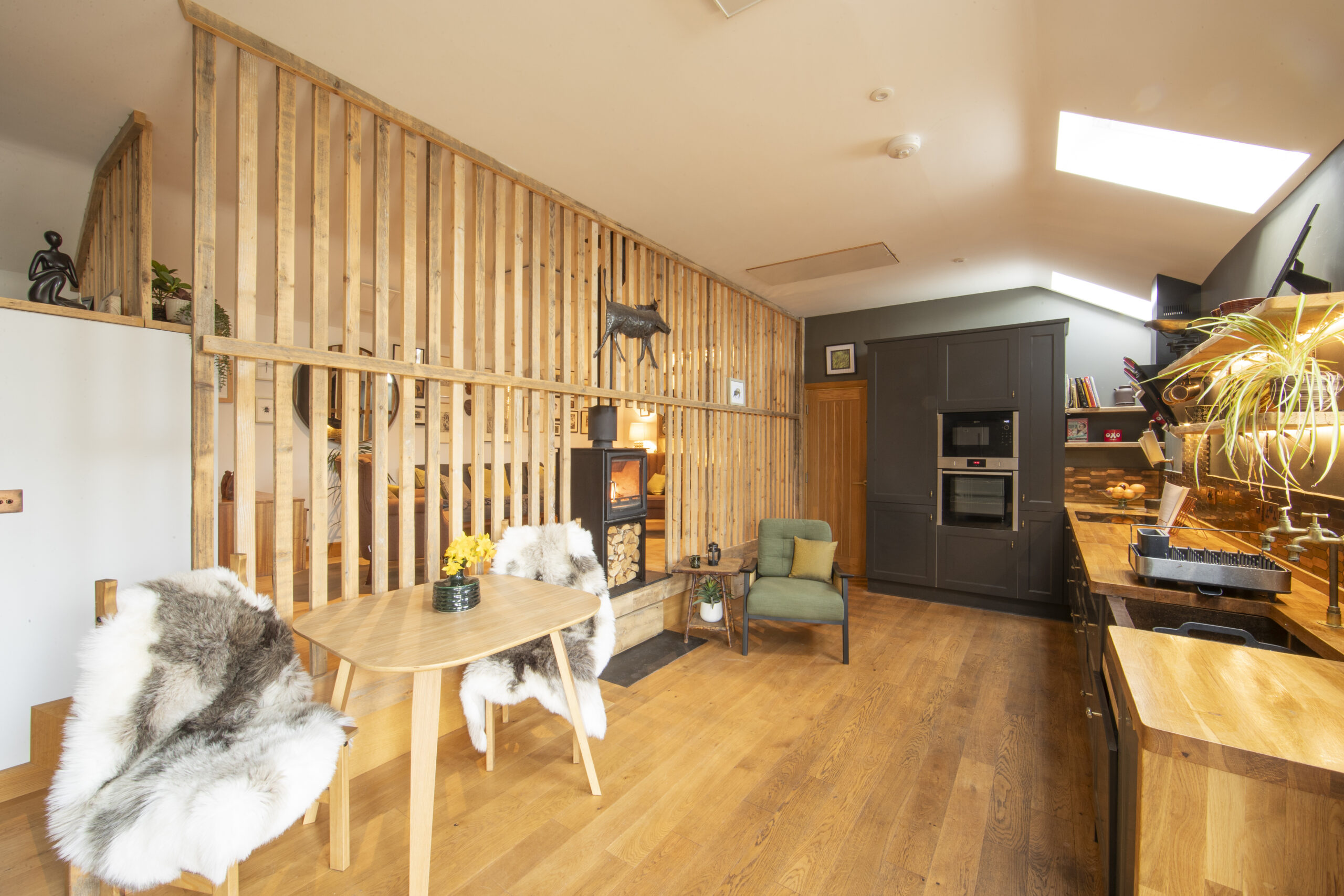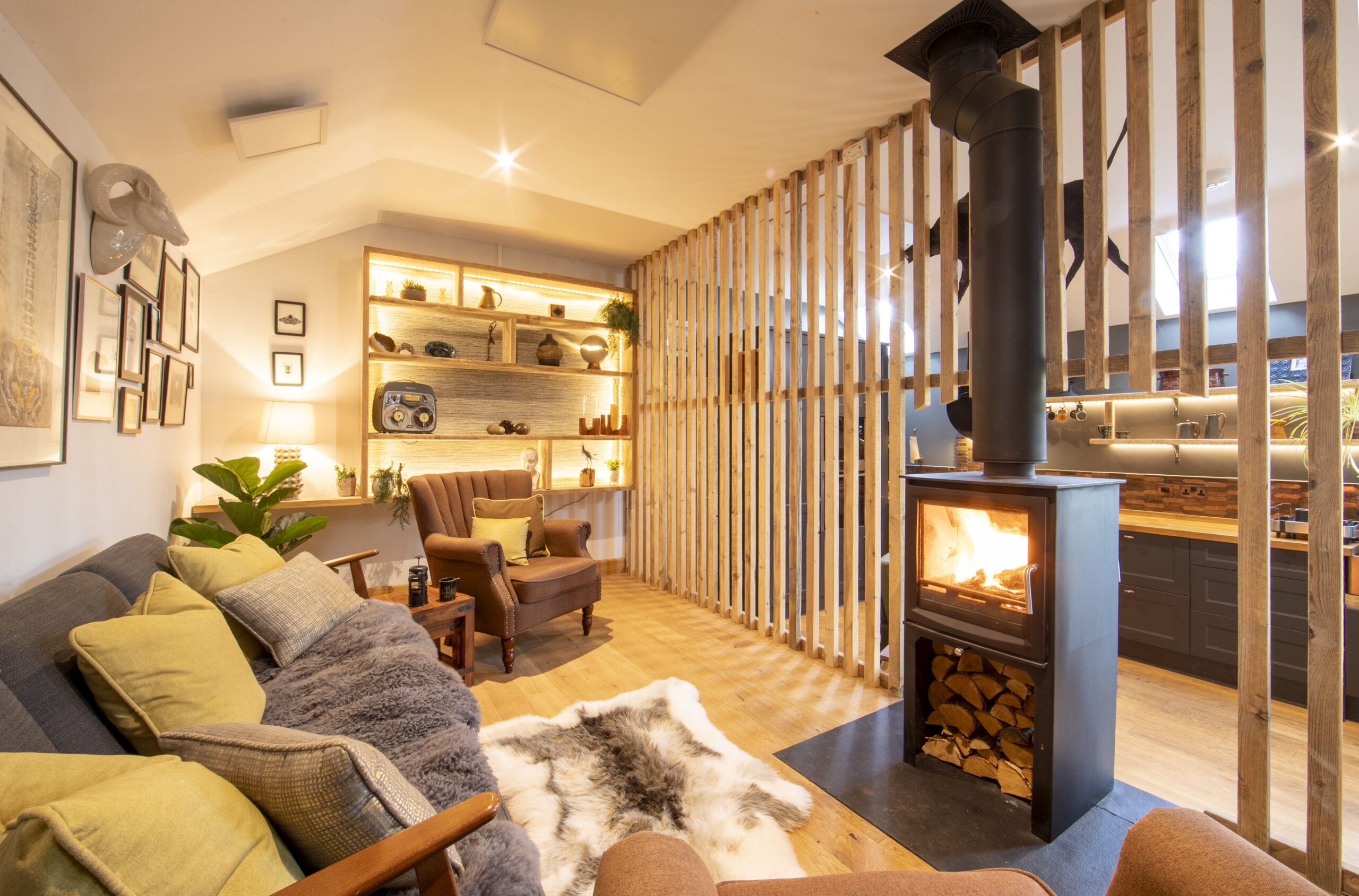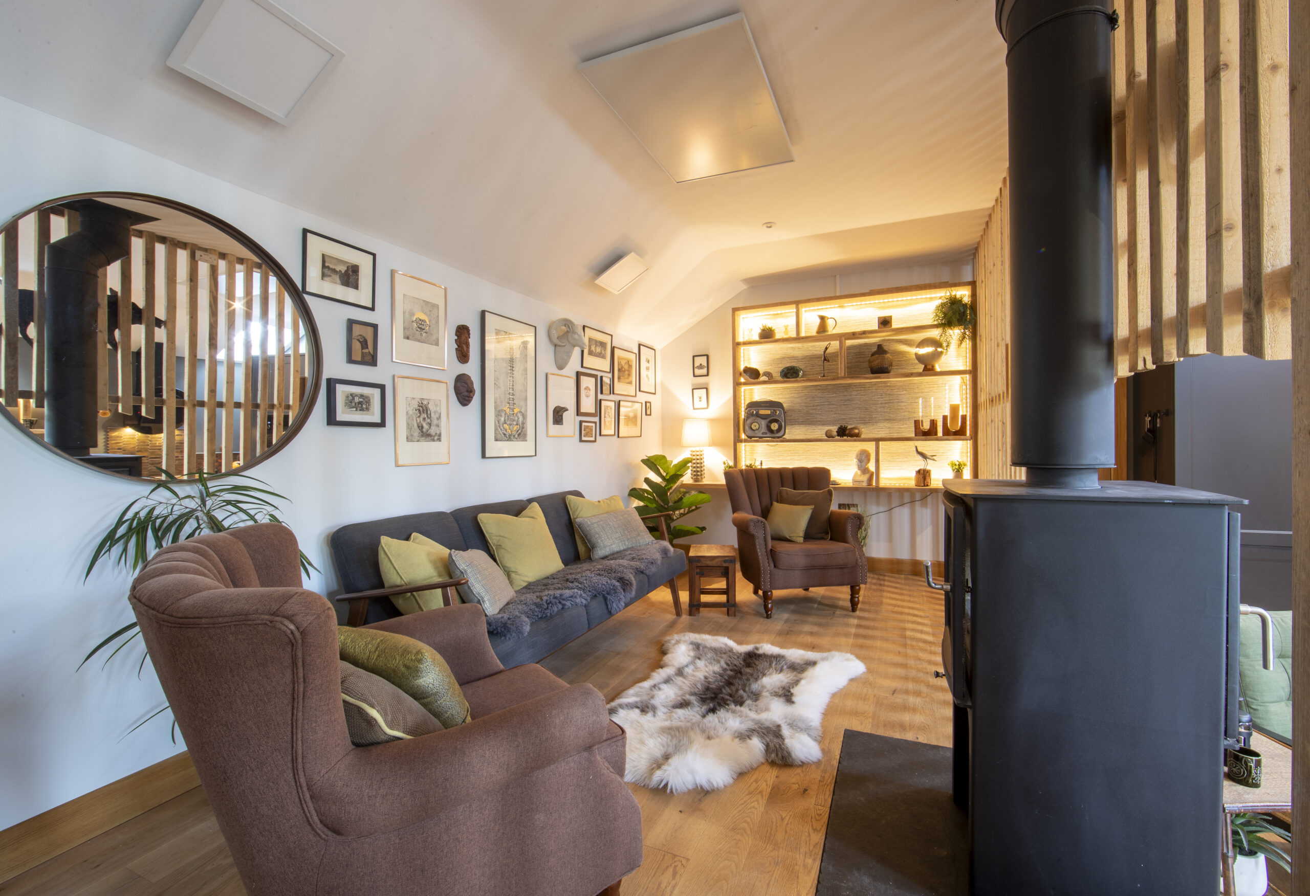At its centre, a large open-plan living space unfolds around a double-aspect wood burner, connecting the sitting rooms and dining areas. The interiors are absolutely beautiful — deep greens, soft taupes — creating a space that feels both relaxed and difficult to leave.
