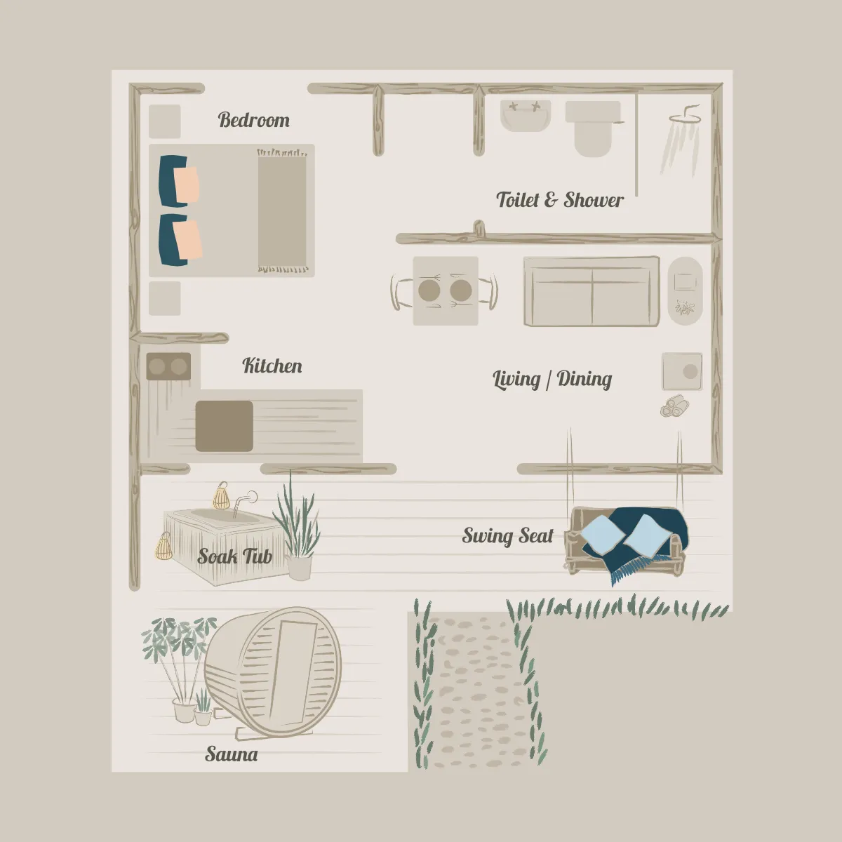 Both cabins have their own enclosed and outside space including: