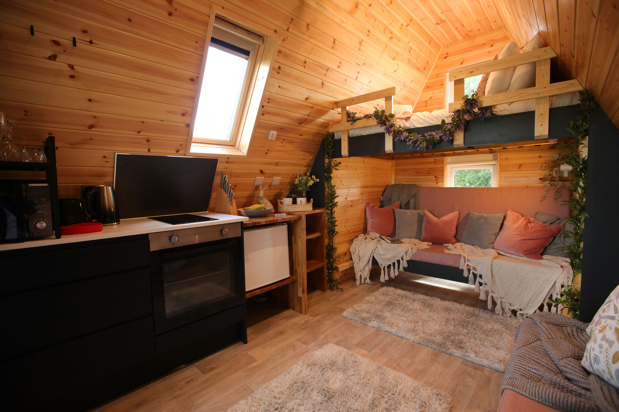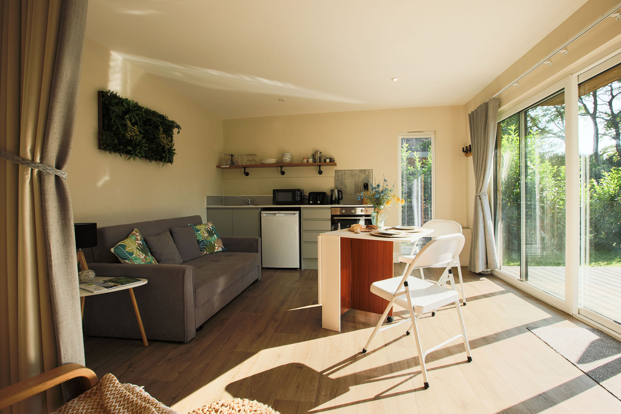 An open-plan lodge with soft lighting, warm wood finishes, and a smart TV, it’s a cosy base for laid-back days and lazy lie-ins.