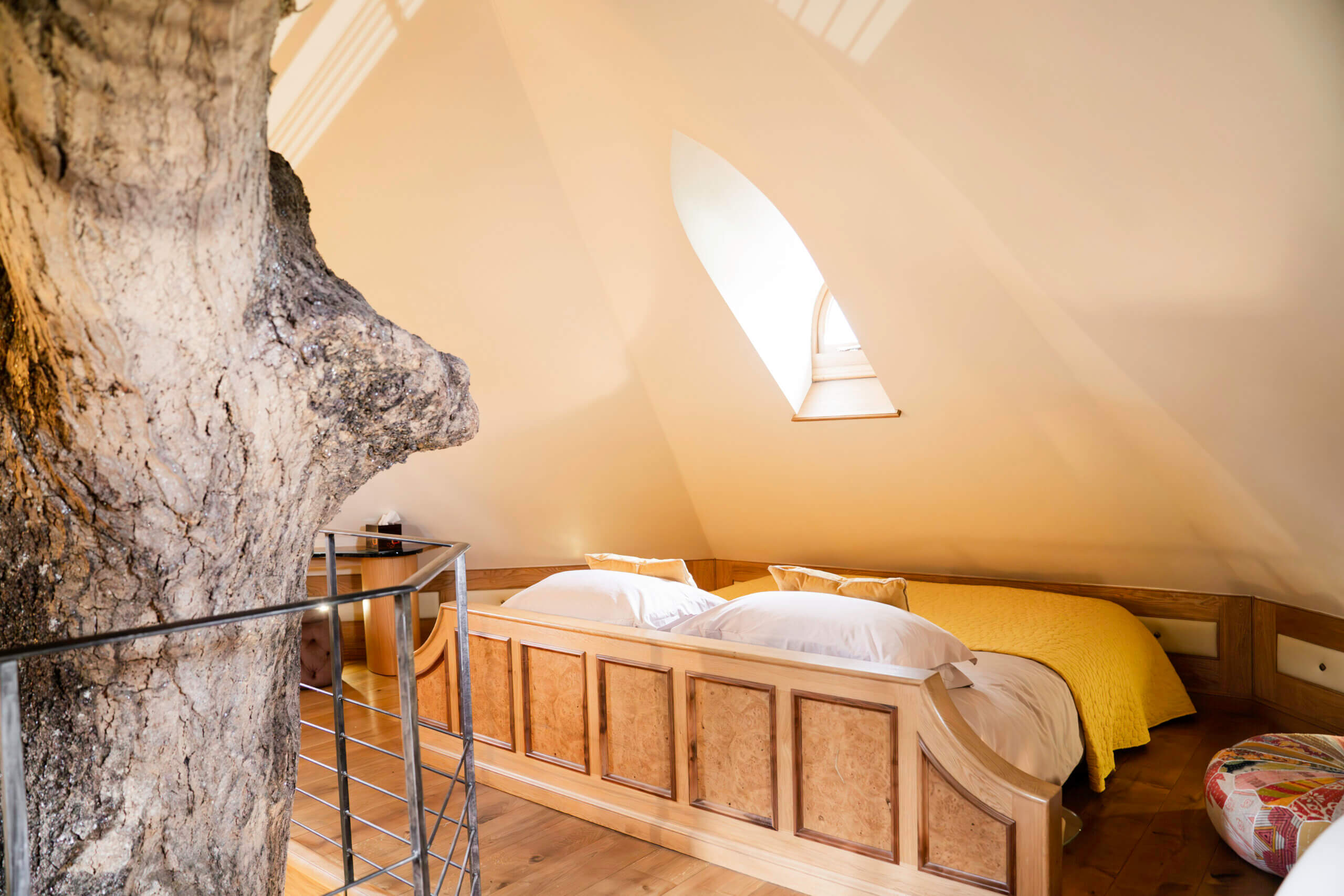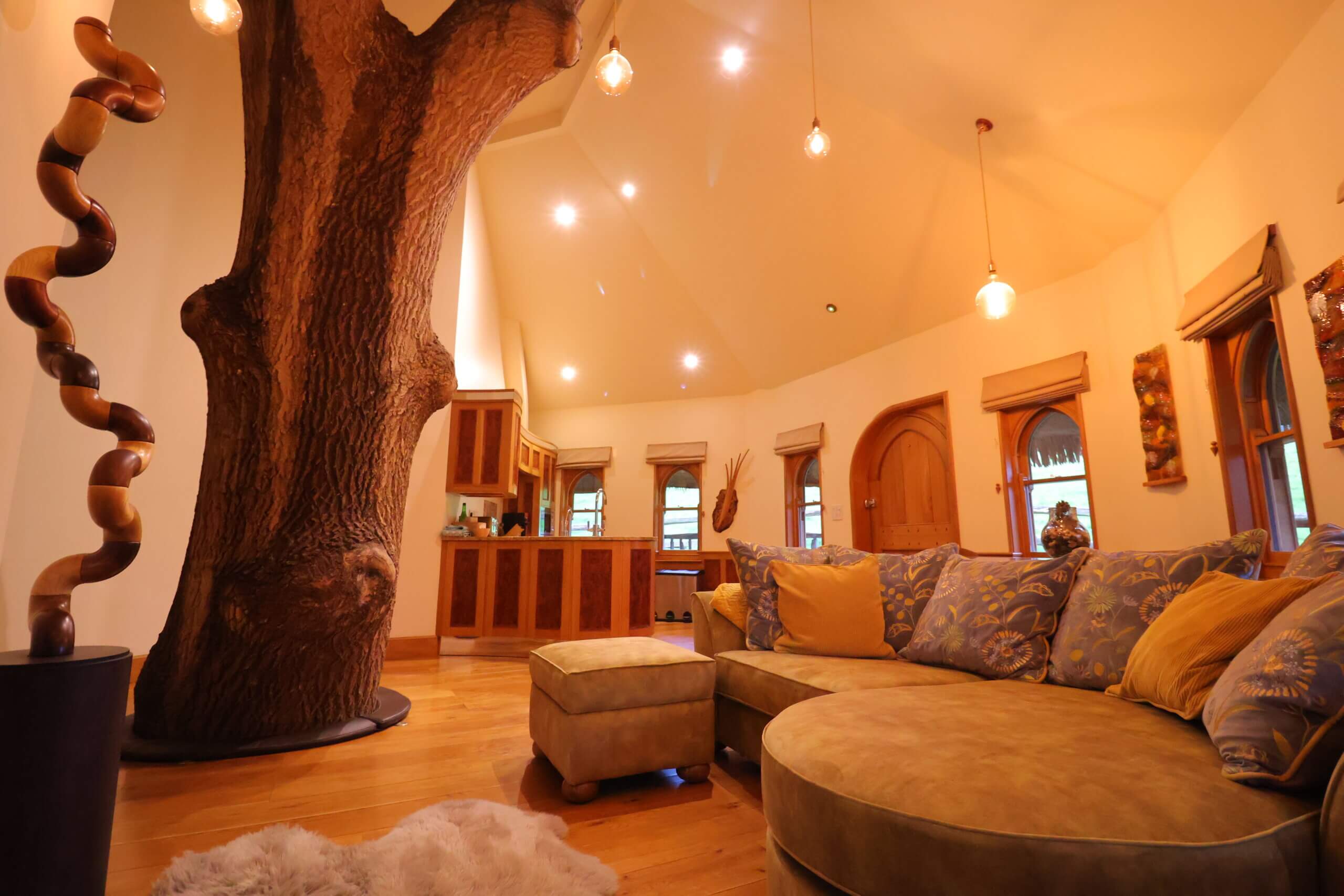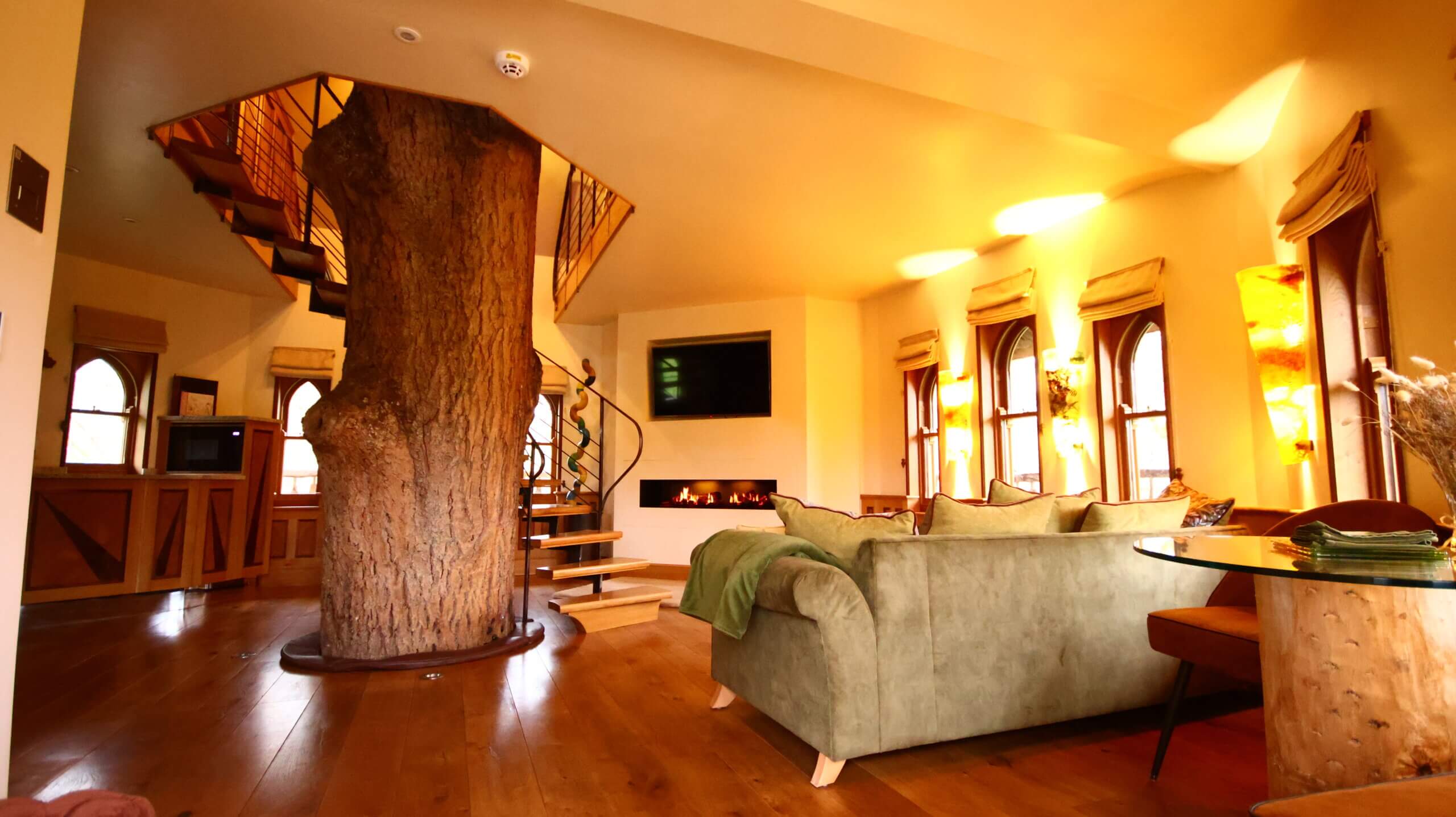 Eathelin is tucked away in a tree top, looking out onto a stone bridge and brooks feeding into the lake, with a spiral staircase wrapped around the central tree trunk.