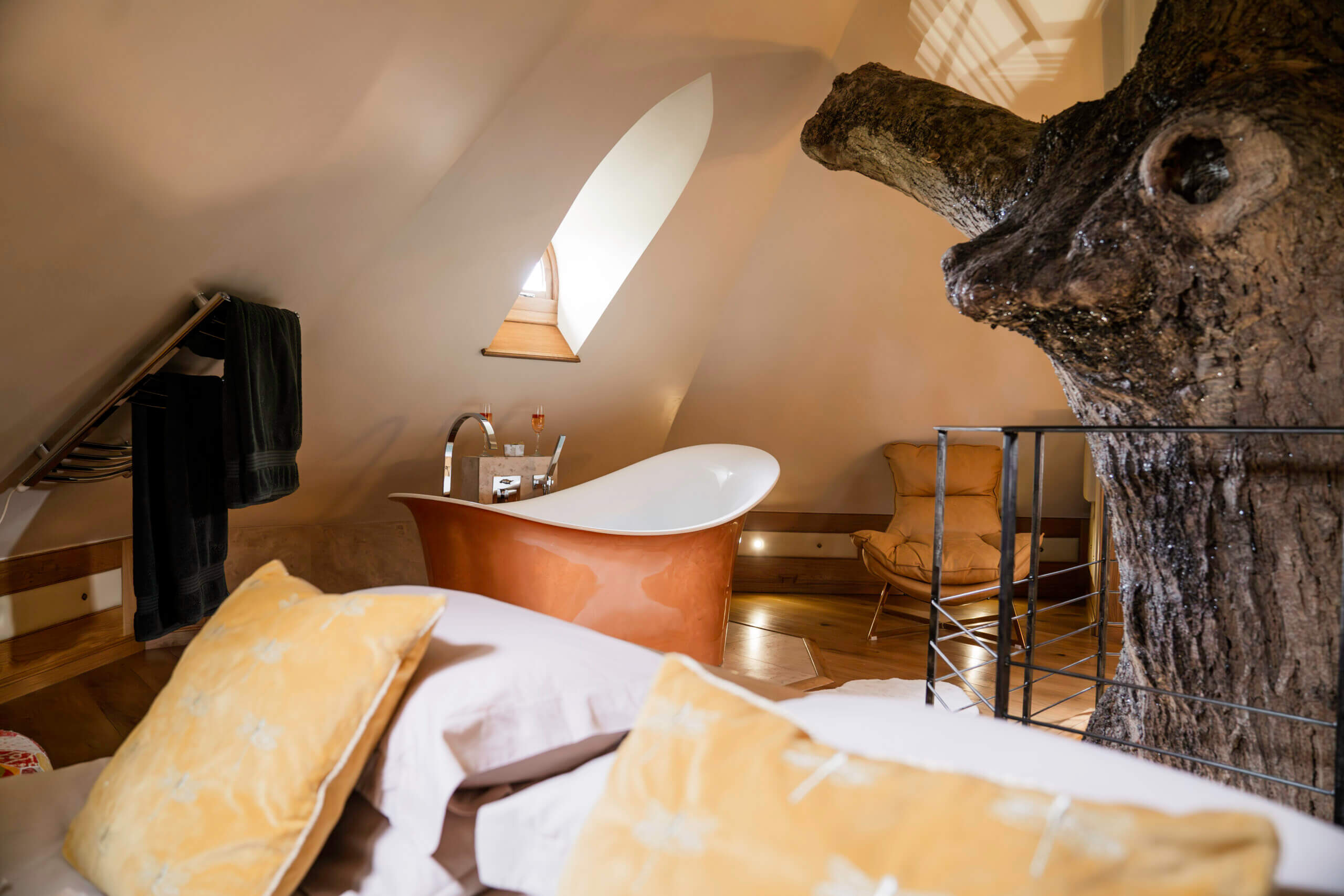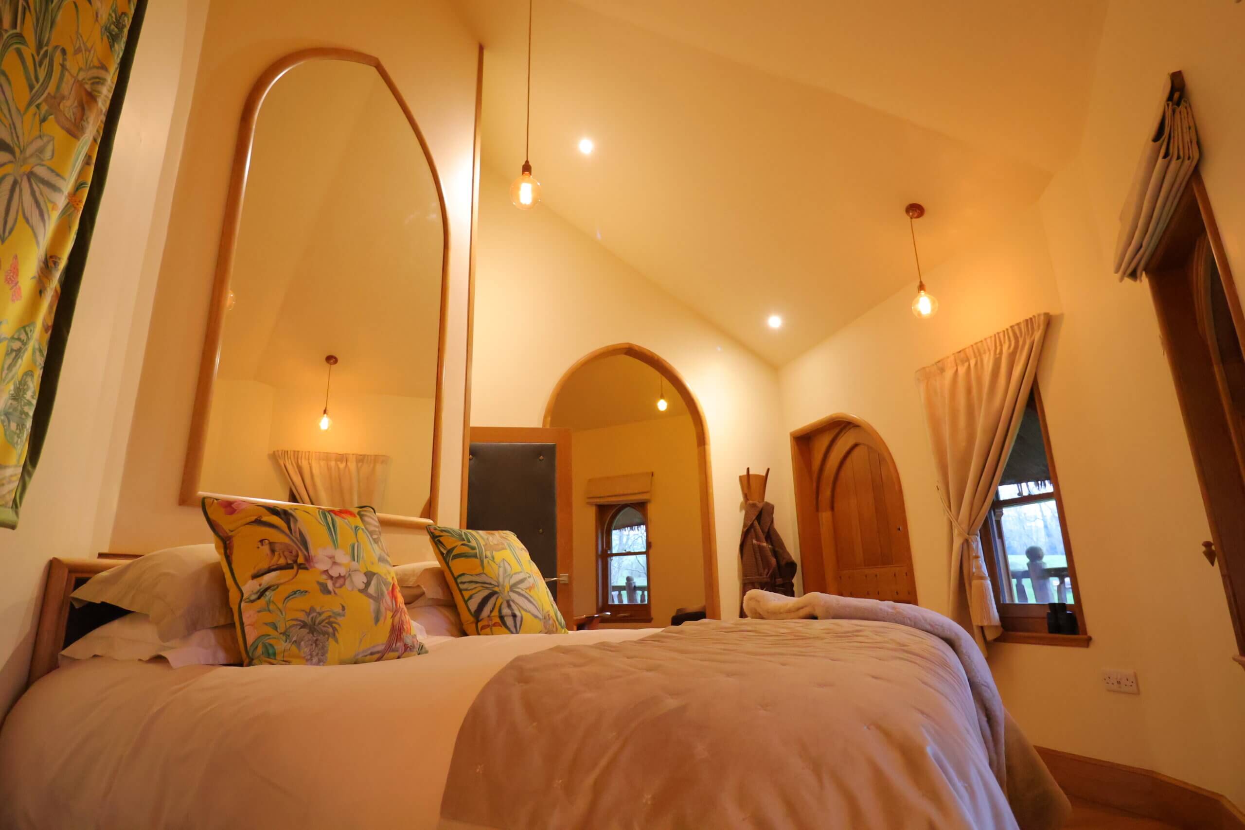 The treehouse has been beautifully decorated with the totally fabulous feel of luxurious interiors and indulgent features. The treehouse has a spacious and open plan sitting room with a snuggle sofa, double-sided open fire place, well equipped kitchen area and an indulgent bathroom with twin sinks and rainfall shower. Vivianna has a bedroom on the same level, with super king size bed and an archway leading to a copper bath, with a private balcony from the bedroom area with stunning countryside views.