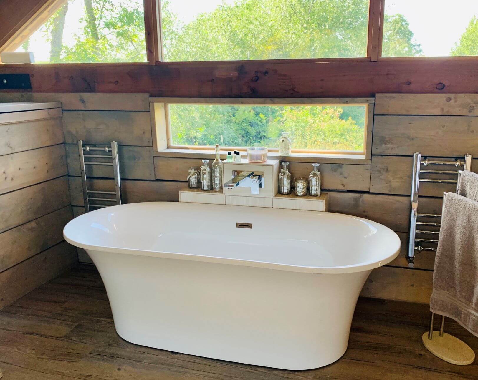 The kitchenette includes everything you need to rustle up a romantic meal or, if the weather is fine, you cook on the BBQ and enjoy al fresco dining. Also on the ground floor is a luxury shower room and on the mezzanine floor there is a stunning free standing bath with outstanding views of the surrounding countryside. The first floor has an open plan living space and dining area with a wood burner and a spacious bedroom with a king size bed with fine Egyptian cotton bed linen.