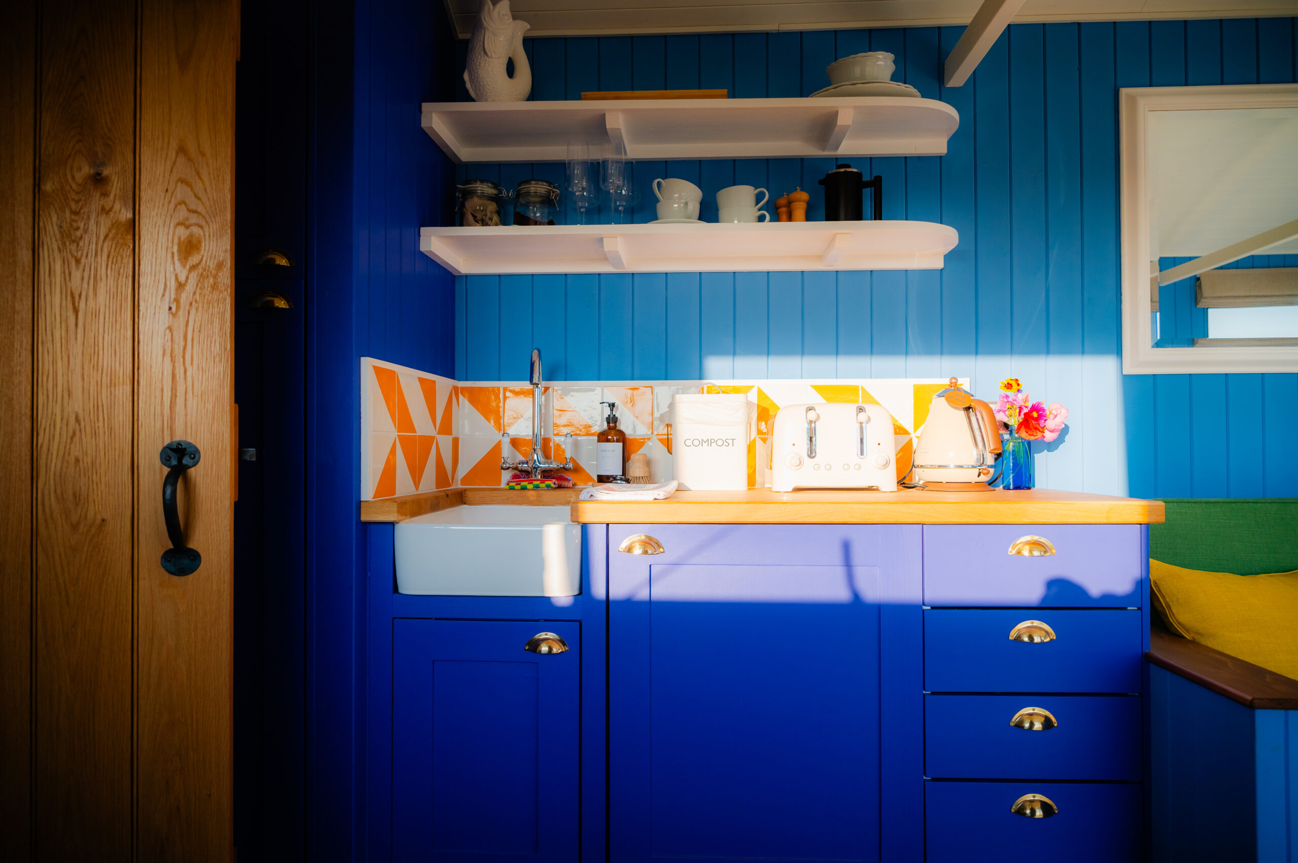- A handy kitchenette with solid oak worktops, fridge-freezer, portable hob, toaster and kettle