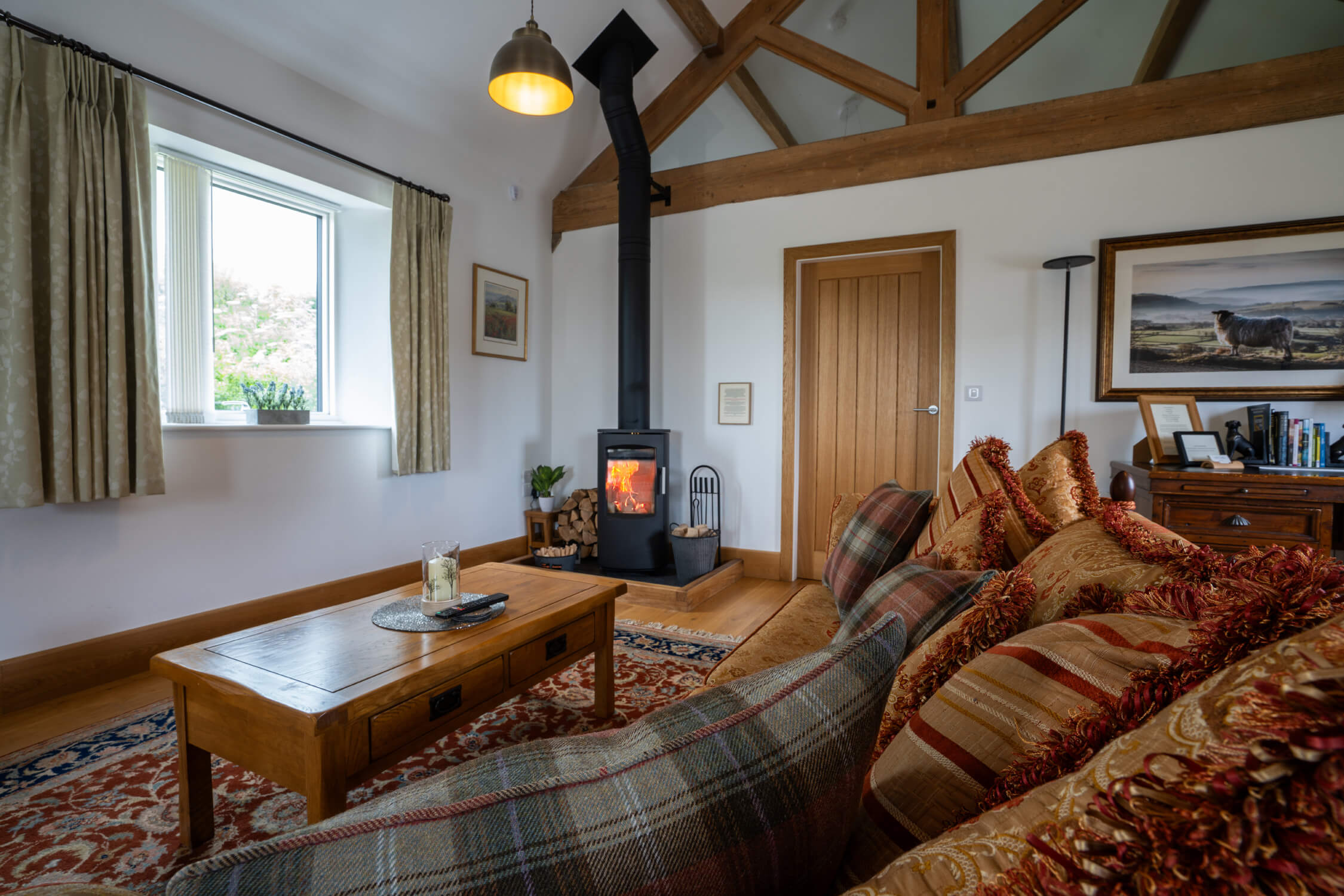 • Living area with two sofas, coffee table, and a roaring log burner – perfect for catching up on your reading during your stay.