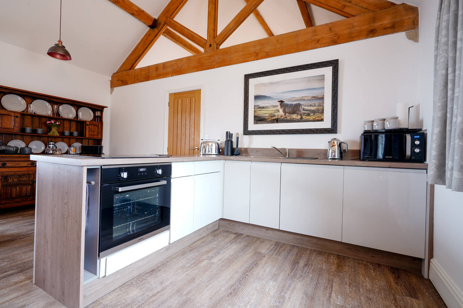 Enjoy spacious, light-filled living space with exposed beams, wooden floors, and large windows throughout. Originally stabling for the farm, the interiors are now warm and inviting with cosy wood burners in each.
