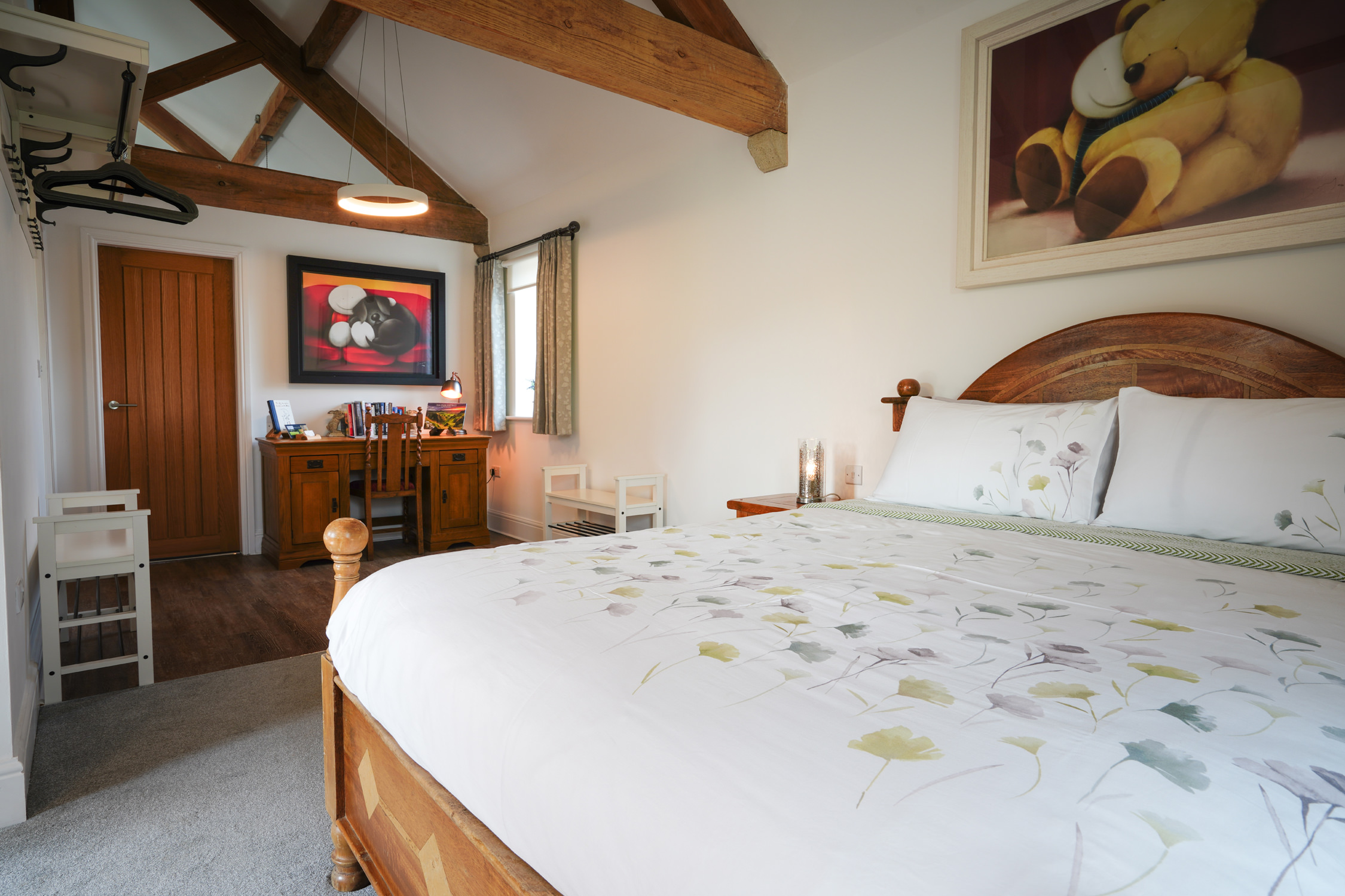 • King-size bedroom with plush linens, double wardrobe, bedside tables, and a dressing table with stool