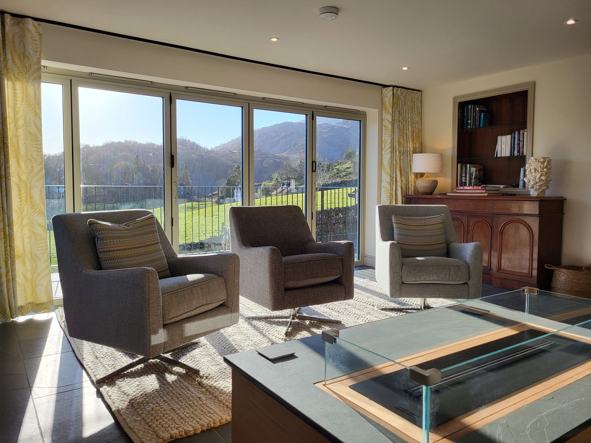 The heart of Wetherlam View is its big open-plan sitting room with bifold doors that frame south-facing views of the dramatic landscapes beyond. There’s also a firepit for cosy nights in, and a dining table that easily fits everyone for long, chatty meals.
