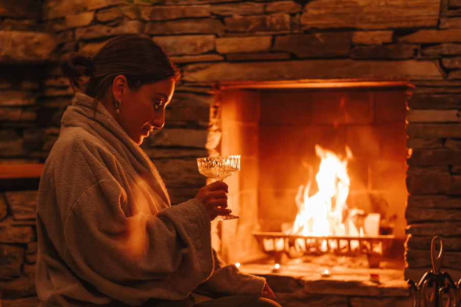 Time here is less structured, moving naturally between the pool, sauna and the stillness of the surrounding landscape. As evening draws in, the atmosphere softens – the fire lit, the light fading across the valley, and the space taking on a more intimate feel.