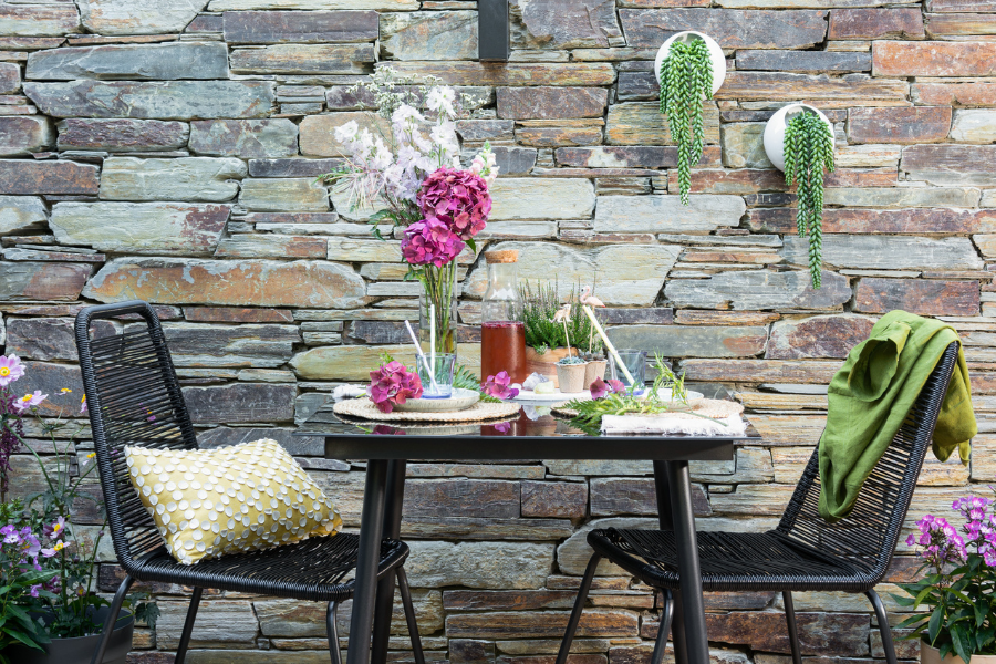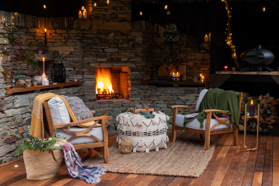• Covered seating area with open log fire, sofa and egg chair for slower evenings outdoors