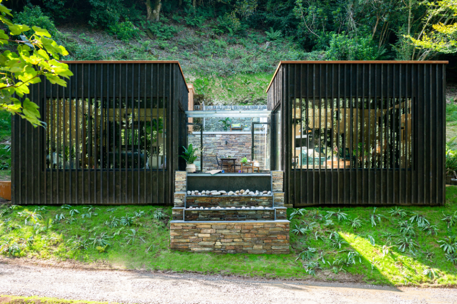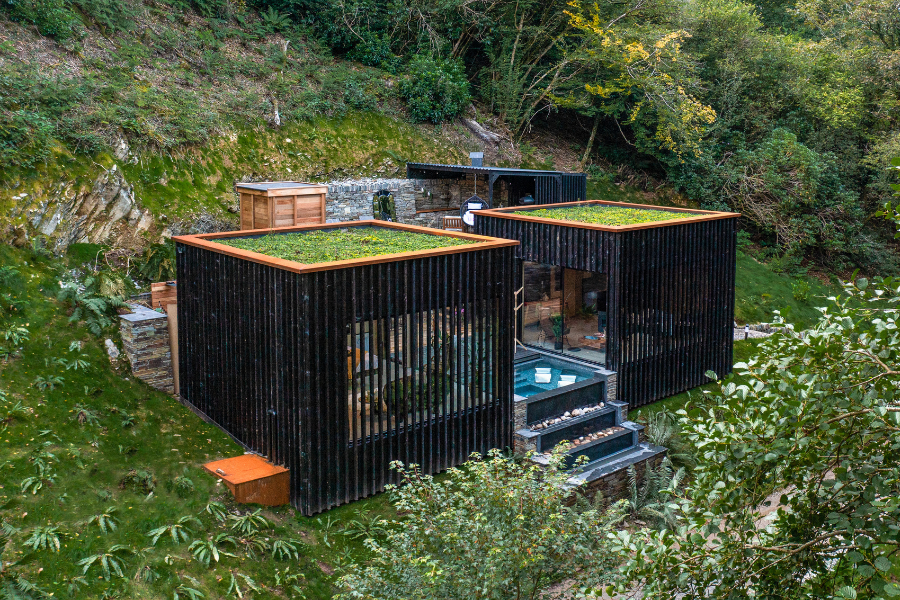Built into the hillside, the accommodation at Wildwood Spa has been thoughtfully designed to sit in harmony with its surroundings. The structure itself is a defining feature, with two striking cuboid forms partially set into the landscape, creating a sense of privacy while framing views out across the valley.