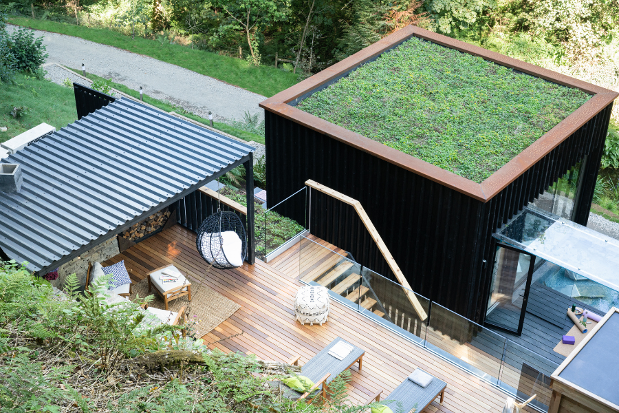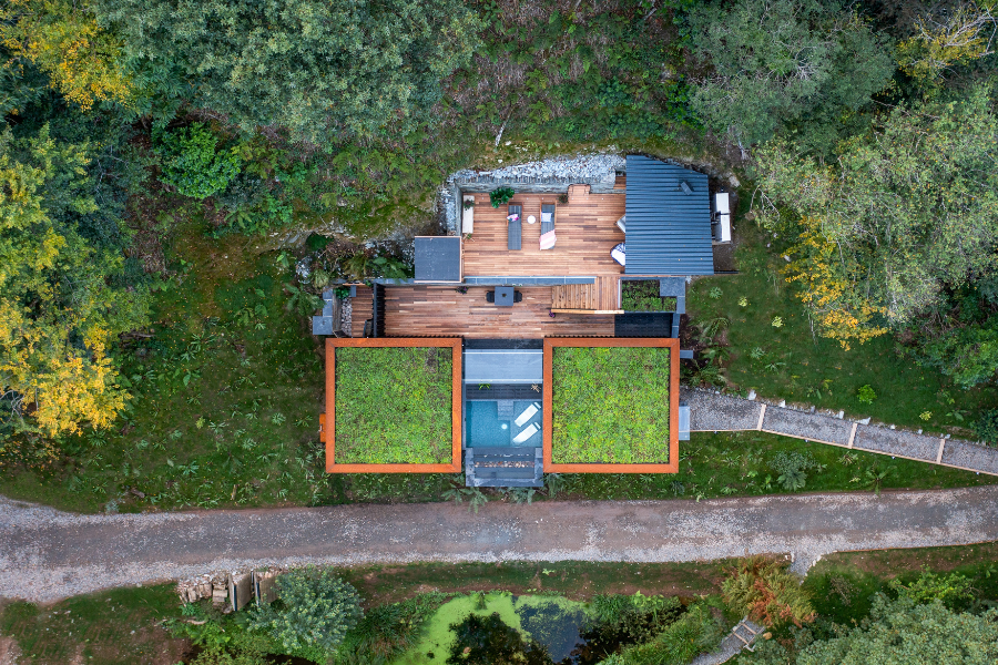 Natural materials, including timber and stone, are used throughout, grounding the space within its setting, while a living sedum roof softens the structure into the landscape.