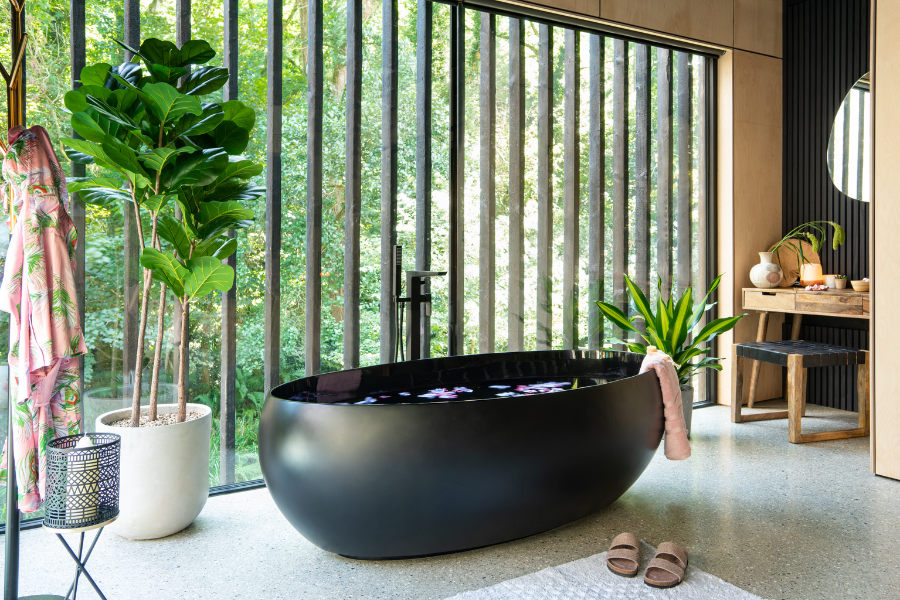 Designed as a calm, open space, the bedroom and bathing areas flow together to create a more relaxed, spa-like feel.