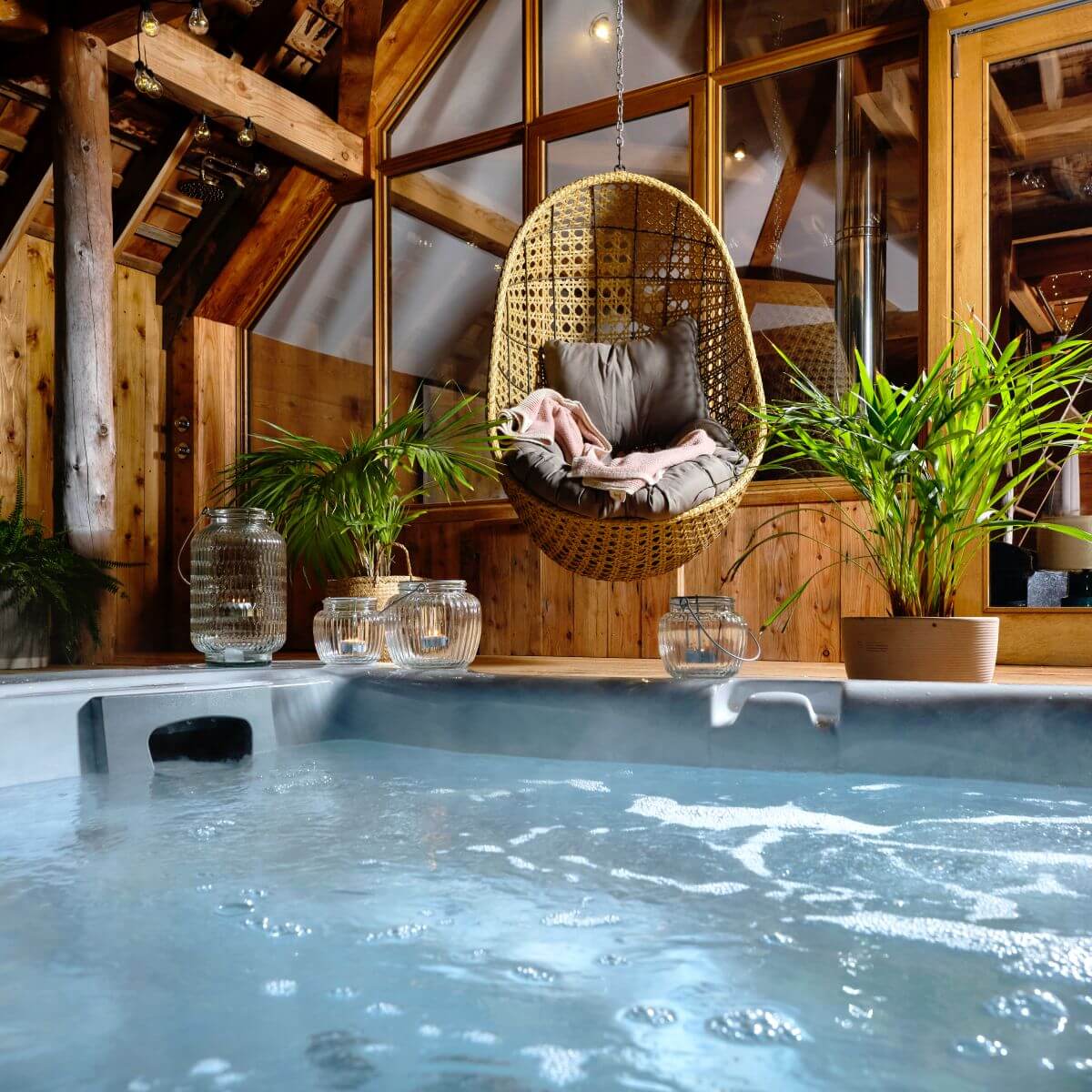 The private spa area includes a sauna, an outdoor cold-water shower, and a sunken hot tub, creating a wonderful wellness experience. Owners Rachel and Sam have thoughtfully designed the space with an open-plan layout, giving it a spacious and luxurious feeling.