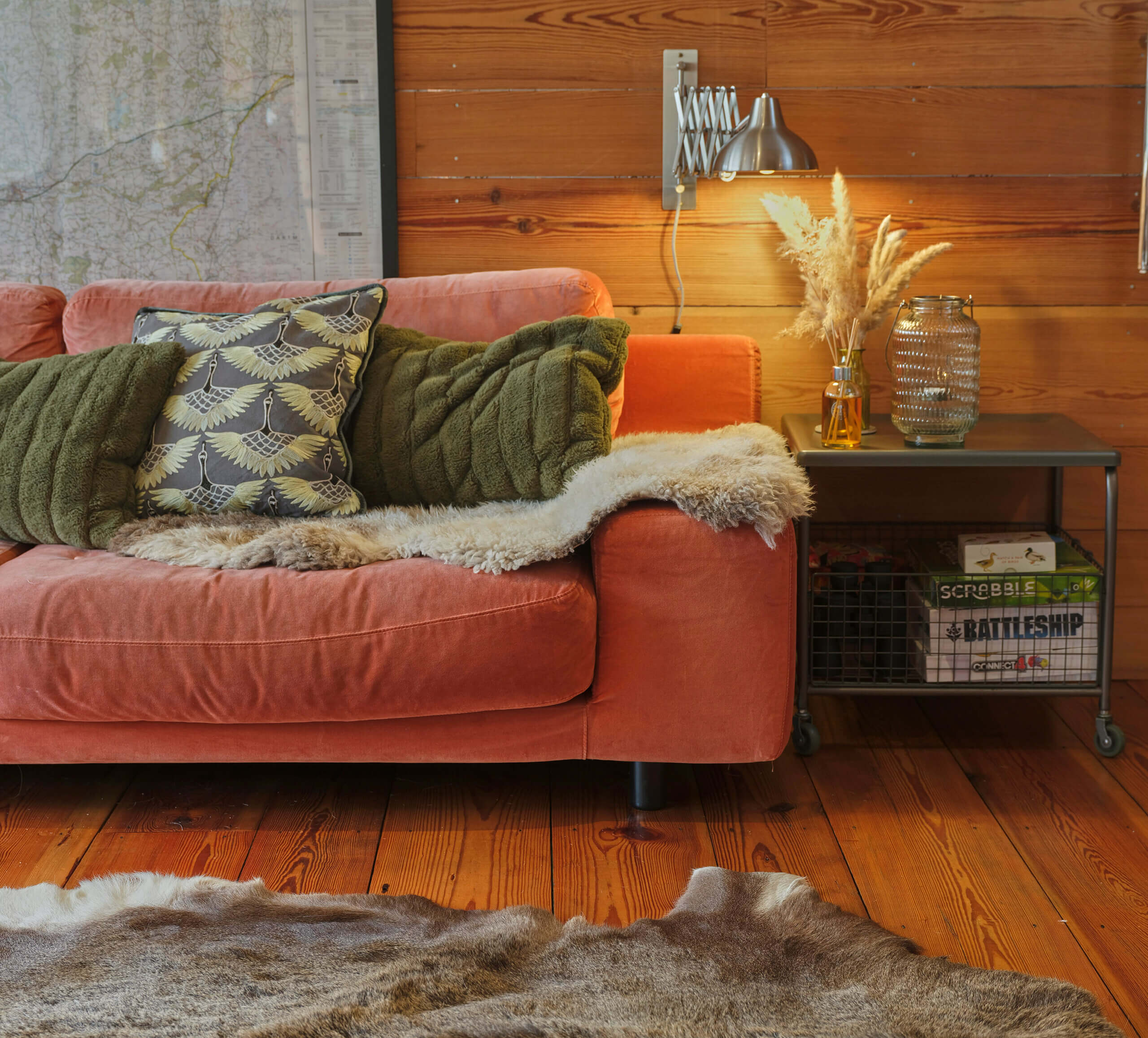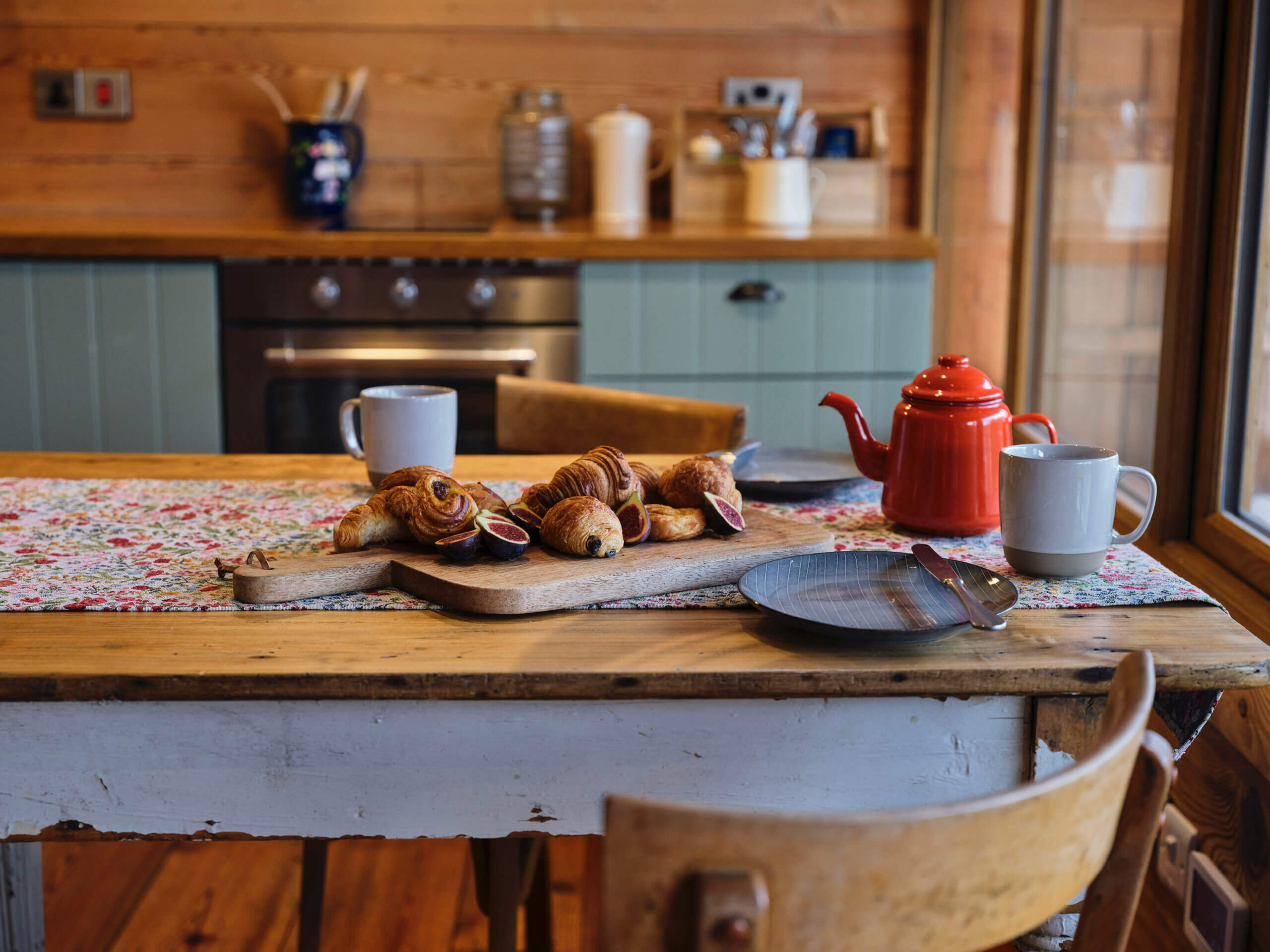 Inside, pine walls and floors, along with a cozy log-burning stove, create a warm Nordic-inspired atmosphere. Floor-to-ceiling windows flood the space with natural light, enhancing the sense of connection with the outdoors. The fully equipped kitchen, inviting sitting area with a gorgeous velvet sofa and a roll-top bath tucked into a cozy alcove near the wood burning stove, make it a truly special retreat.